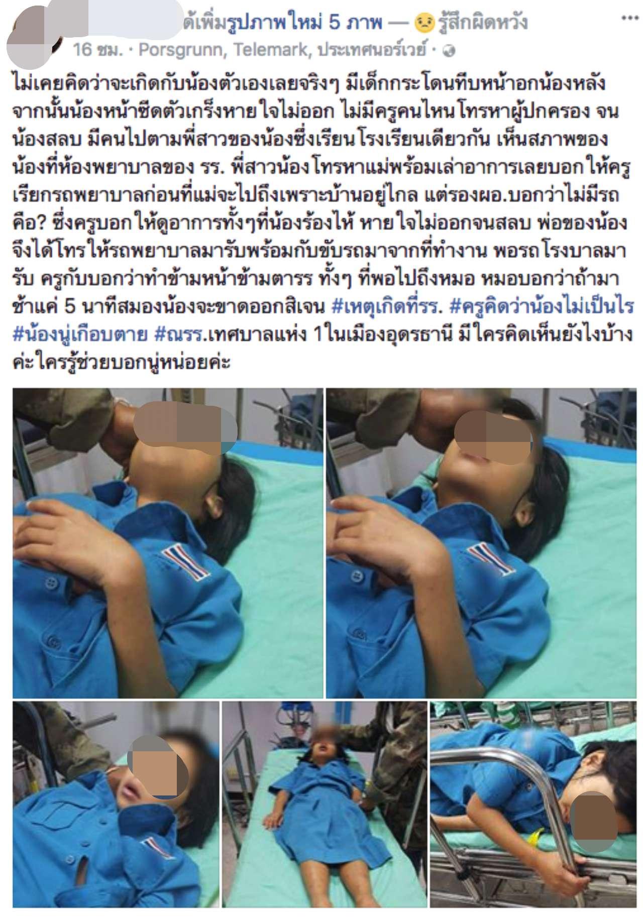 "แต่หลังจากนั้น มีการโพสต์ภาพข้อความในช่วงเย็นวันจันทร์ โดยบุคคลอื่น ซึ่งไม่ทราบรายละเอียดตรงนี้ จึงไม่เข้าใจในเหตุการณ์ที่เกิดขึ้น เมื่อวานนี้หลังจากเด็กมาโรงเรียน ก็มีอาการหายใจหอบขึ้นมาอีก ทางโรงเรียนก็รีบนำตัวเด็กส่งโรงพยาบาลด้วยรถยนต์ของครูที่นำตัวเด็กส่งเอง และก็อยู่กับผู้ปกครองเด็ก จนเด็กออกจากโรงพยาบาล โดยทางเราก็คุยกับผู้ปกครองตลอด เมื่อคืนก็คุยกันถึงเรื่องที่มีการโพสต์เฟซบุ๊กไป โดยทางผู้ปกครองเด็กก็บอกว่าไม่ทราบเรื่องการโพสต์ เพราะคนโพสต์ คือ หลานที่อยู่ต่างประเทศ ซึ่งทางผู้ปกครองบอกจะไปคุยกับคนโพสต์ ถึงข้อมูลที่ไม่ตรงกับข้อเท็จจริง"