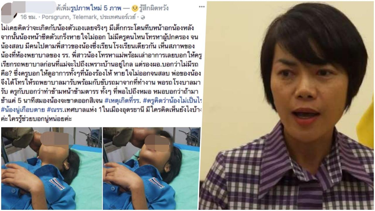 ผอ.โรงเรียนเทศบาล 3 บ้านเหล่า ออกมาชี้แจง หลังสาวโพสต์เฟซบุ๊ก ระบุ น้องสาวโดนเพื่อนถีบหน้าอกจนเป็นลม ปรากฏคนโพสต์อยู่เมืองนอก พบข้อมูลที่ให้ไม่ตรงกับความเป็นจริง
