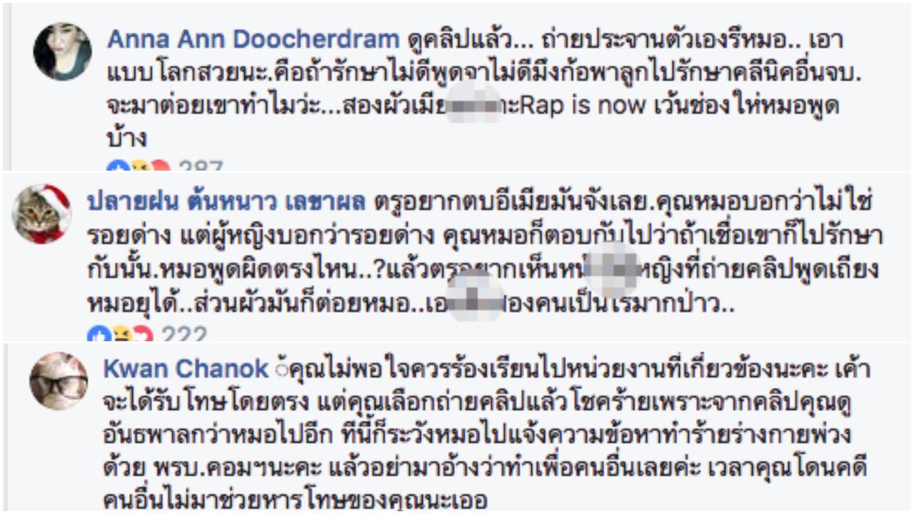 ขณะที่ความเห็นของชาวโซเชียล มองไปในทิศทางเดียวกันคือ ดูคลิปแล้ว ถ่ายประจานตัวเองรึหมอ เอาแบบโลกสวยนะ คือถ้ารักษาไม่ดีพูดจาไม่ดีก็พาลูกไปรักษาคลินิกอื่นจบ จะมาต่อยเขาทำไม สองผัวเมียยังกับ Rap is now เว้นช่องให้หมอพูดบ้าง