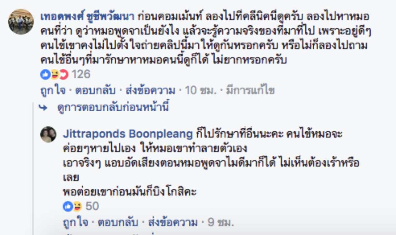 ก่อนคอมเมนต์ ลองไปที่คลินิกนี้ดูครับ ลองไปหาหมอคนที่ว่า ดูว่าหมอพูดจาเป็นยังไง แล้วจะรู้ความจริงของที่มาที่ไป เพราะอยู่ดีๆ คนไข้เขาคงไม่ไปตั้งใจถ่ายคลิปนี้มาให้ดูกันหรอกครับ หรือไม่ก็ลองไปถามคนไข้อื่นๆ ที่มารักษาหาหมอคนนี้ดูก็ได้ ไม่ยากหรอกครับ