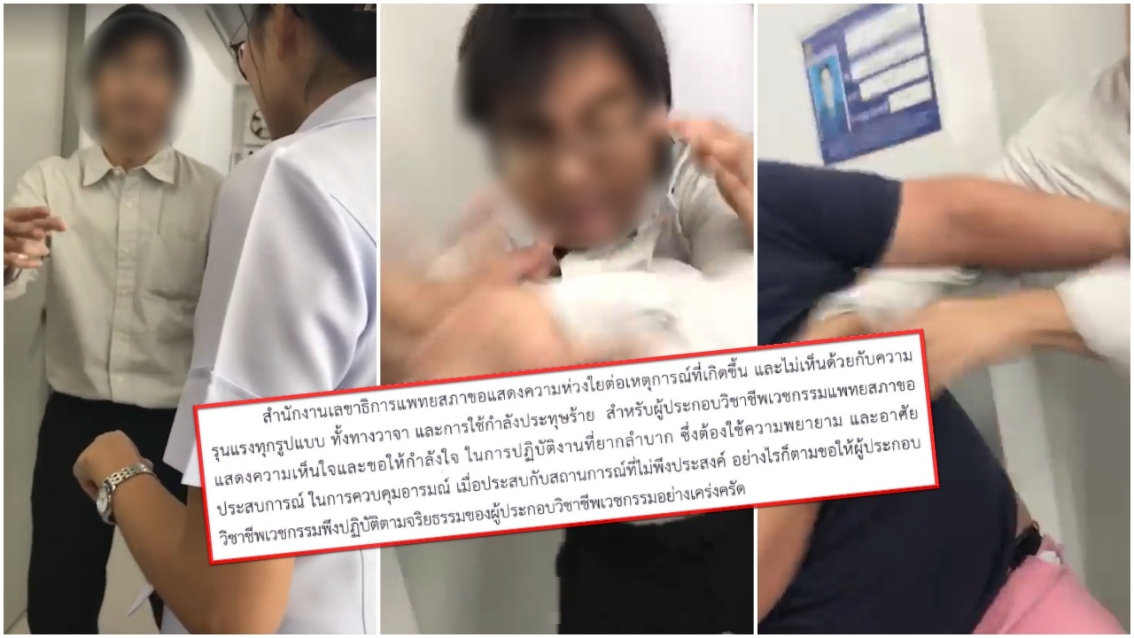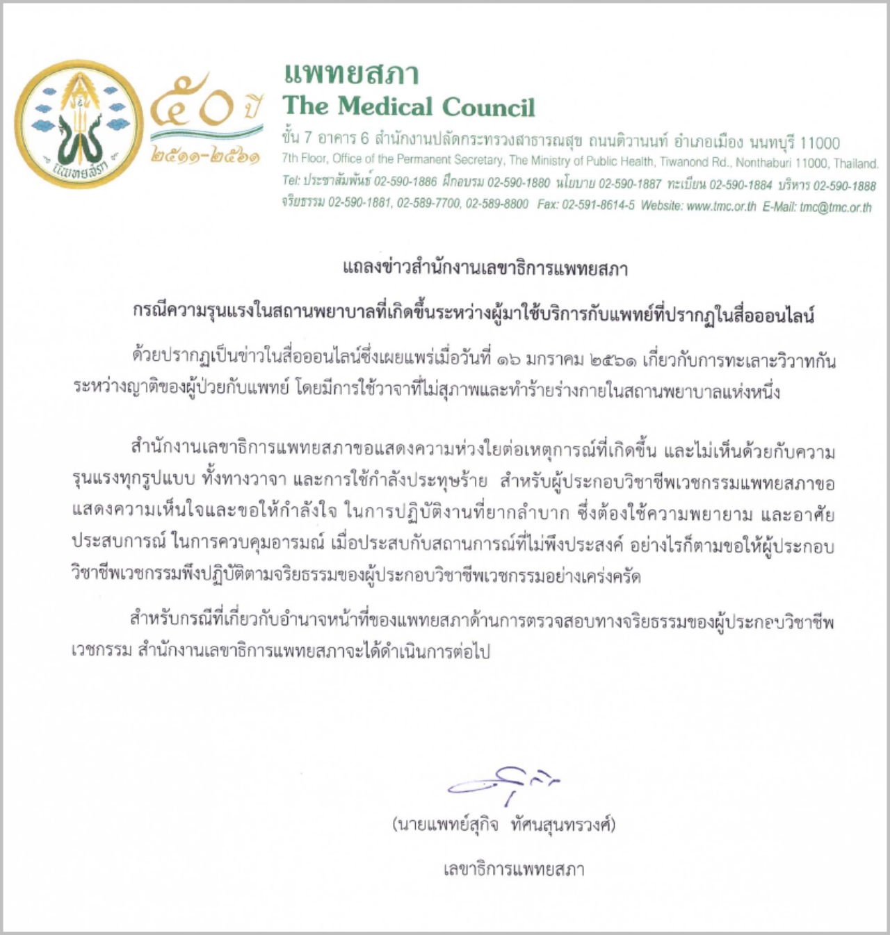 สำนักงานเลขาธิการแพทยสภา ขอแสดงความห่วงใยต่อเหตุการณ์ที่เกิดขึ้น และไม่เห็นด้วยกับความรุนแรงทุกรูปแบบ ทั้งทางวาจาและการใช้กำลังประทุษร้าย สำหรับผู้ประกอบวิชาชีพเวชกรรมแพทยสภาขอแสดงความเห็นใจและขอให้กำลังใจในการปฏิบัติงานที่ยากลำบาก ซึ่งต้องใช้ความพยายามและอาศัยประสบการณ์ในการควบคุมอารมณ์ เมื่อประสบกับสถานการณ์ที่ไม่พึงประสงค์ อย่างไรก็ตาม ขอให้ผู้ประกอบวิชาชีพเวชกรรมพึงปฏิบัติตามจริยธรรมของผู้ประกอบวิชาชีพเวชกรรมอย่างเคร่งครัด