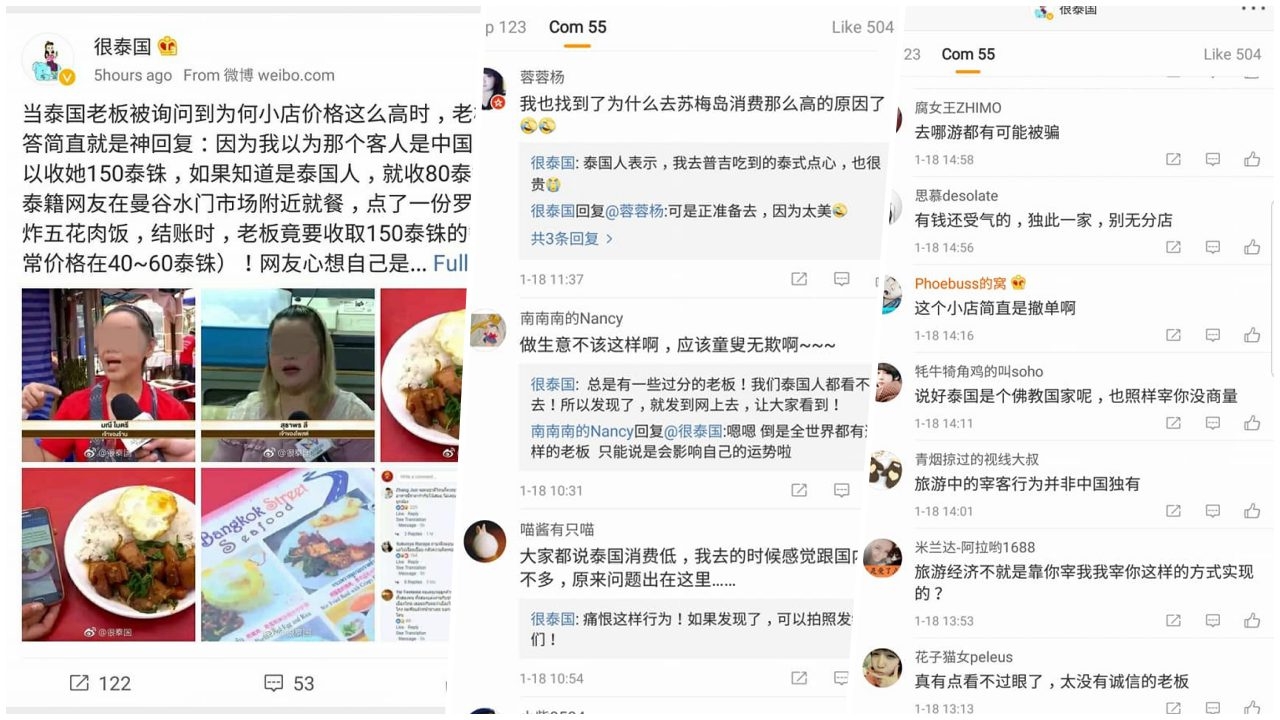 หลังจากแอดมินอ้ายจง เปิด Weibo เข้าไปเช็กเพจ 很泰国 เพจเล่าเรื่องเมืองไทยให้คนจีนเข้าใจ ต้องถึงกับอึ้ง คือคนจีนแห่มาแสดงความคิดเห็น กดไลค์ กดแชร์ข่าว "แม่ค้าขายอาหาร ขายราคาแพง แบ่งเรตราคา ราคาคนจีน (ต่างชาติ) และคนไทย"