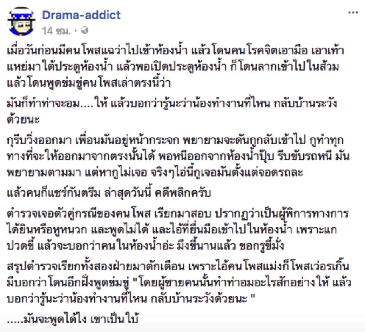 อย่างไรก็ตาม หลังจากข่าวนี้เผยแพร่ออกไป ปรากฏว่า แฟนเพจเฟซบุ๊ก แอดมินจ่า Drama-addict มีการพูดถึงประเด็นนี้ว่า คดีพลิกครับ ตำรวจเจอตัวคู่กรณีของคนโพสต์ เรียกมาสอบ ปรากฏว่าเป็นผู้พิการทางการได้ยิน หรือหูหนวก และพูดไม่ได้ และไอ้ที่ยื่นมือเข้าไปในห้องน้ำ เพราะแกปวดอึ แล้วจะบอกว่าคนในห้องน้ำอะ อึนานแล้ว ขอผมอึบ้าง