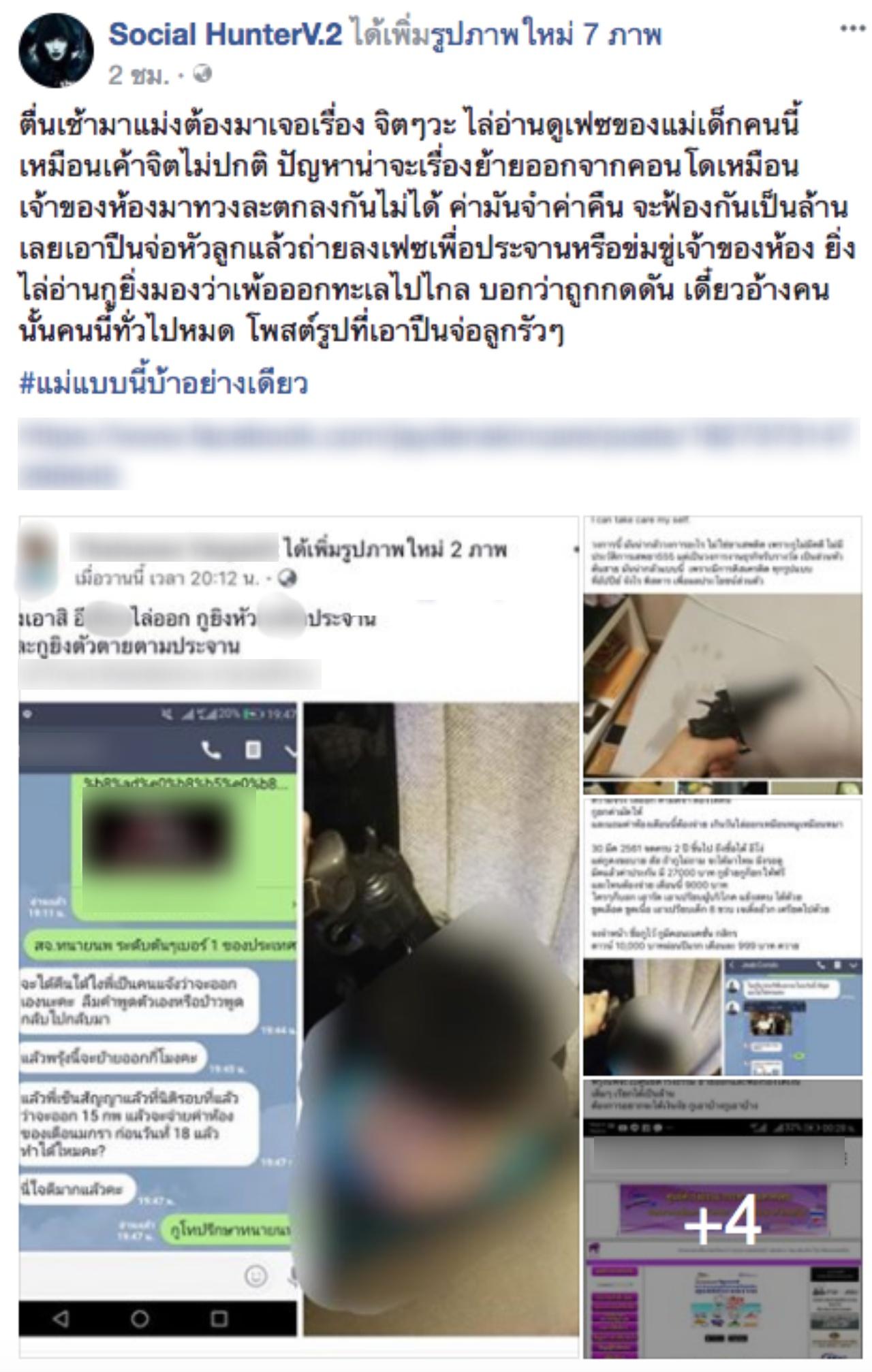 เพจ Social HunterV.2 ได้นำโพสต์ของหญิงสาวรายหนึ่งที่ได้ถ่ายภาพขณะเอาปืนจ่อหัวลูกชายวัย 8 ขวบ ขู่ว่า หากคอนโดไล่ออกจากห้องจะยิงลูกชายและยิงตัวเอง โดยคาดว่าสาเหตุมาจากเครียดที่เจ้าของมาทวงค่าห้อง และไม่ได้ค่ามัดจำคืน