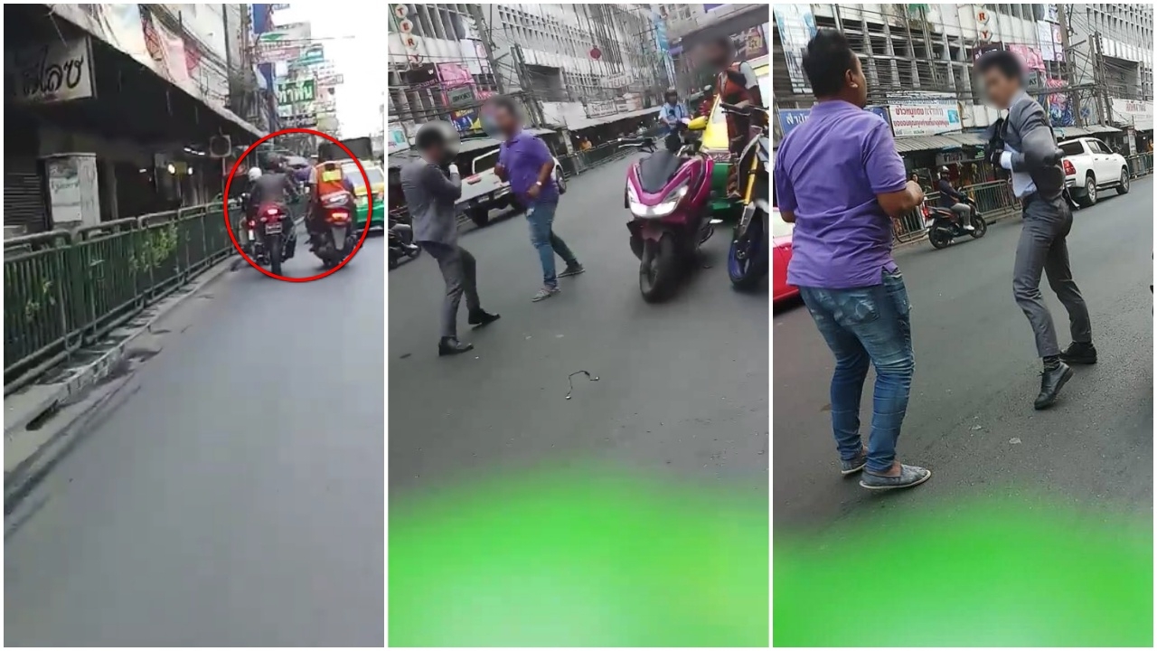 เหตุการณ์เริ่มจากรถจักรยานยนต์พยายามจะขี่แทรกไปในช่องระหว่างรถบนถนนที่ค่อนข้างแคบ และสุดท้ายก็เกิดการเฉี่ยวชนรถเบนซ์โดยไม่มีการขอโทษ อีกทั้งยังมองหน้าและพูดจาไม่ดีใส่คนขับรถเบนซ์ ก่อนเร่งเครื่องหนีไป ต่อมามีชายสวมชุดสูทขับขี่รถจักรยานยนต์ตามไปเตือนประมาณว่าทำไม่ถูก แต่พอคนทำผิดโดนเตือนกลับด่าเสียๆ หายๆ แบบไม่ละอายใจ ก่อนจะใช้มือซ้ายตบเข้าที่หมวกกันน็อกของชายสวมชุดสูท ก่อนเกิดการชกต่อยกันเกิดขึ้น ท่ามกลางเสียงคนร้องห้าม และระหว่างที่ต่อยกันไปได้สักพักชายเสื้อม่วงก็พูดขึ้นว่า “เก่งเหรอไอ้สั_” ก่อนจะมีคนกลางเข้ามาช่วยห้ามปราม