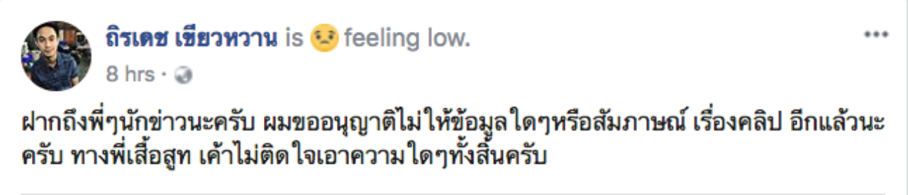 ส่วนกรณีที่เจ้าของคลิปโพสต์ผ่านเฟซบุ๊กว่า “ทางพี่เสื้อสูท เขาไม่ติดใจเอาความใดๆ ทั้งสิ้นครับ” ผกก.สน.พระโขนง กล่าวว่ายังไม่ได้รับทราบเรื่อง
