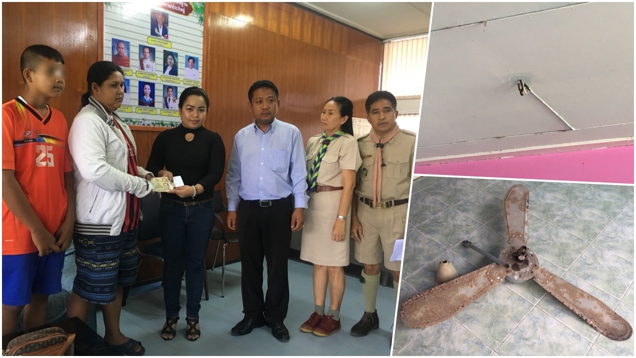 ครูพาดูห้องเกิดเหตุพัดลมเพดานตกใส่เด็ก ป.6 ดั้งจมูกแตก ยืนยันรีบพาส่ง รพ. ทันที ส่วนเงิน 1,000 บาท รอง ผอ.มอบช่วยเหลือเบื้องต้น สั่งถอดรุ่นเก่าออกหมดแล้ว