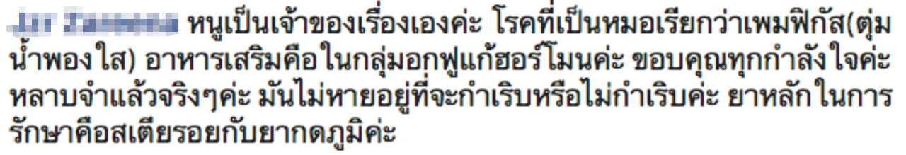 นอกจากนี้ เจ้าของเรื่องยังได้มาแสดงความคิดเห็นด้วยว่า โรคที่เป็นหมอเรียกว่าเพมฟิกัส (ตุ่มน้ำพองใส) อาหารเสริมคือในกลุ่มอกฟูแก้ฮอร์โมน ขอบคุณทุกกำลังใจ หลาบจำแล้วจริงๆ มันไม่หายอยู่ที่จะกำเริบหรือไม่กำเริบค่ะ ยาหลักในการรักษาคือสเตียรอยด์กับยากดภูมิ.