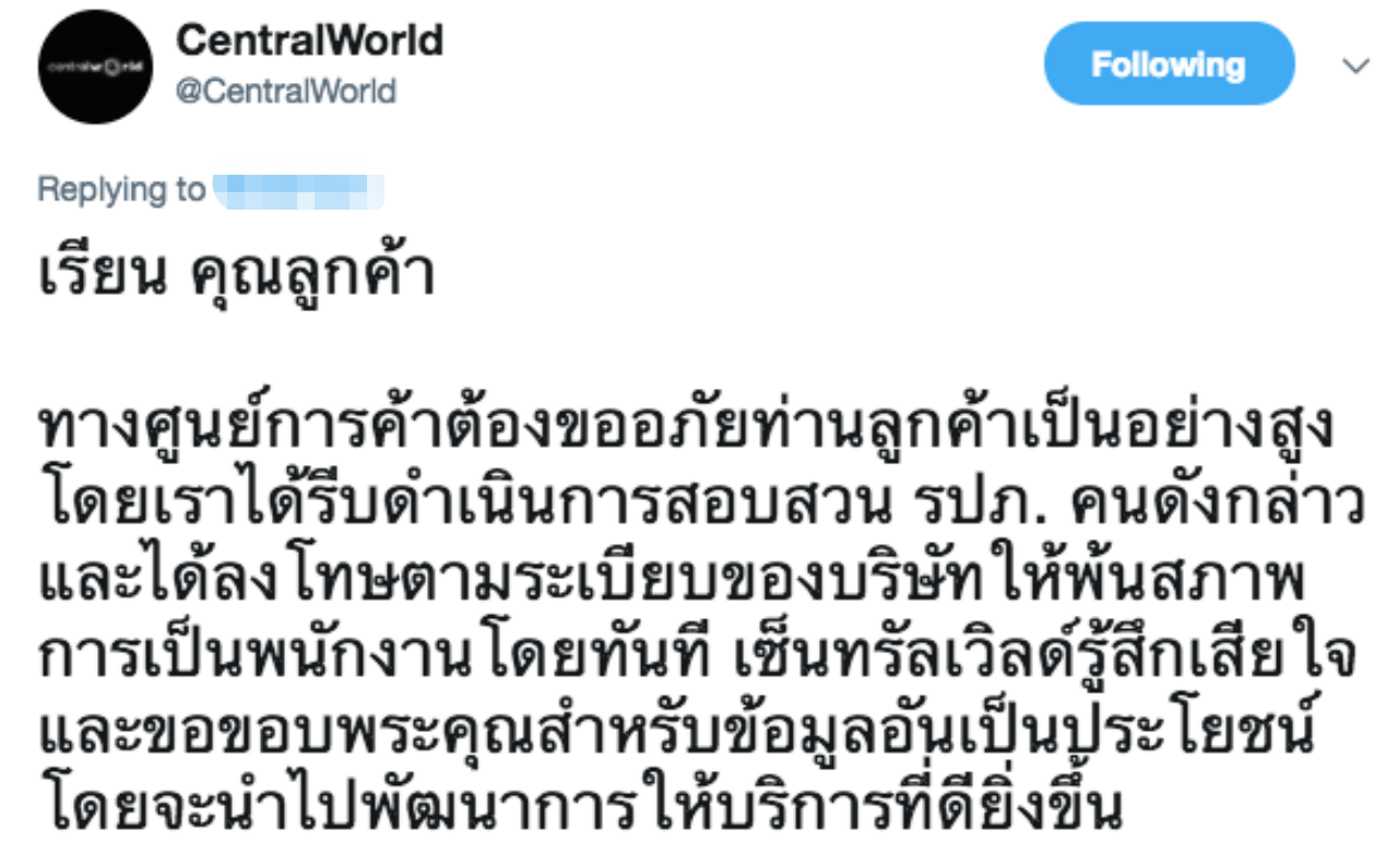 ต่อมาทาง CentralWorld ได้เข้ามาตอบกลับถึงกรณีนี้ว่า “ต้องขออภัยท่านลูกค้าเป็นอย่างสูง โดยเราได้รีบดำเนินการสอบสวน รปภ.คนดังกล่าว และได้ลงโทษตามระเบียบของบริษัทให้พ้นสภาพการเป็นพนักงานโดยทันที เซ็นทรัลเวิลด์รู้สึกเสียใจ และขอขอบพระคุณสำหรับข้อมูลอันเป็นประโยชน์ โดยจะนำไปพัฒนาการให้บริการที่ดียิ่งขึ้น”