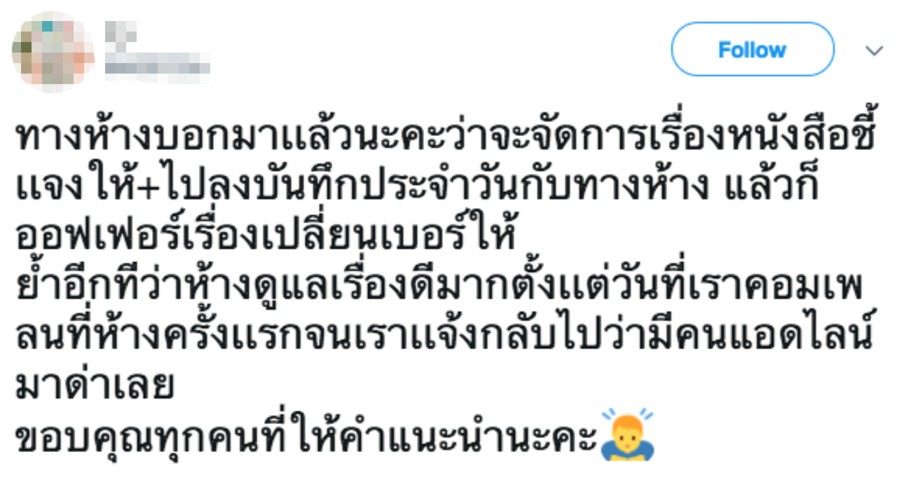 ล่าสุด เมื่อเวลาประมาณ 12.30 น. วันนี้ เจ้าตัวทวีตข้อความอีกครั้งว่า ได้รับการติดต่อจากทางห้างแล้วว่าจะจัดการเรื่องหนังสือชี้เเจงให้และไปลงบันทึกประจำวันกับทางห้าง รวมถึงเรื่องเปลี่ยนเบอร์ให้ ย้ำอีกทีว่าห้างดูแลเรื่องดีมากตั้งเเต่วันเริ่มแจ้งคอมเพลน.