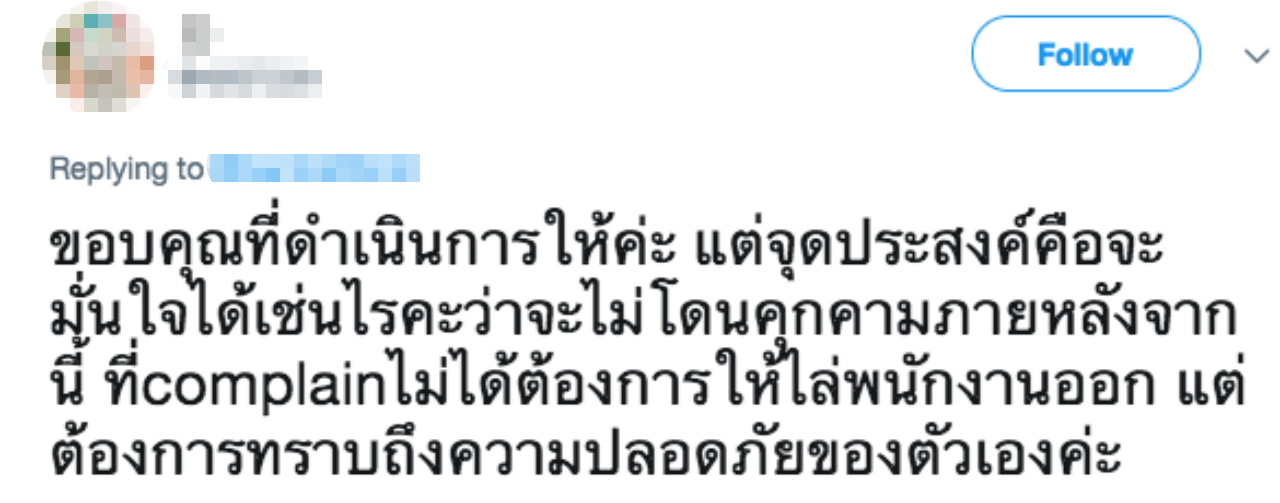 ทั้งนี้ ผู้ใช้ทวิตเตอร์รายนี้ได้ขอบคุณในการดำเนินการ แต่ก็ได้ถามกลับว่า จะมั่นใจได้อย่างไรว่าจะไม่โดนคุกคามภายหลังจากนี้ ที่คอมเพลนไม่ได้ต้องการให้ไล่พนักงานออก แต่ต้องการทราบถึงความปลอดภัยของตัวเอง ซึ่งล่าสุดทางห้างยังไม่ได้มีการมาตอบกลับข้อความนี้