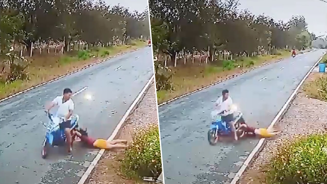 เตือนภัย! ชายหญิงขี่รถจักรยานยนต์มาตามถนน สาวคนซ้อนเสื้อกันหนาวหลุดพันโซ่ล้อรถดึงร่างกระแทกพื้น ไถลตามถนน บาดเจ็บ...