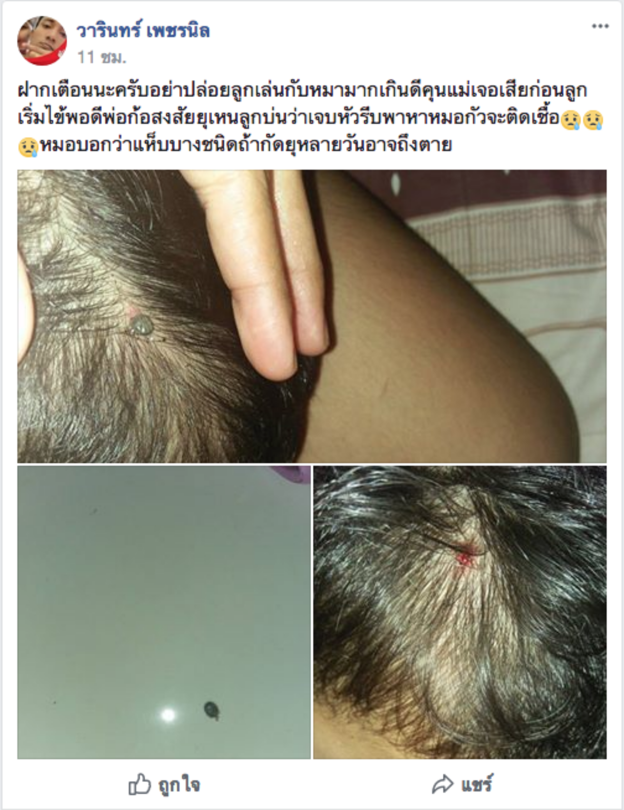 ผู้ใช้เฟซบุ๊ก วารินทร์ เพชรนิล ได้โพสต์เรื่องราวลงในกลุ่ม HerKid รวมพลคนเห่อลูก พร้อมระบุข้อความว่า ฝากเตือนนะครับ อย่าปล่อยลูกเล่นกับหมามากเกิน ดีคุณแม่เจอเสียก่อน ลูกเริ่มเป็นไข้พอดี พ่อก็สงสัยอยู่ เห็นลูกบ่นว่าเจ็บหัวรีบพาหาหมอกลัวจะติดเชื้อ ทั้งนี้หมอบอกว่าเห็บบางชนิด ถ้ากัดอยู่หลายวันอาจถึงตาย.