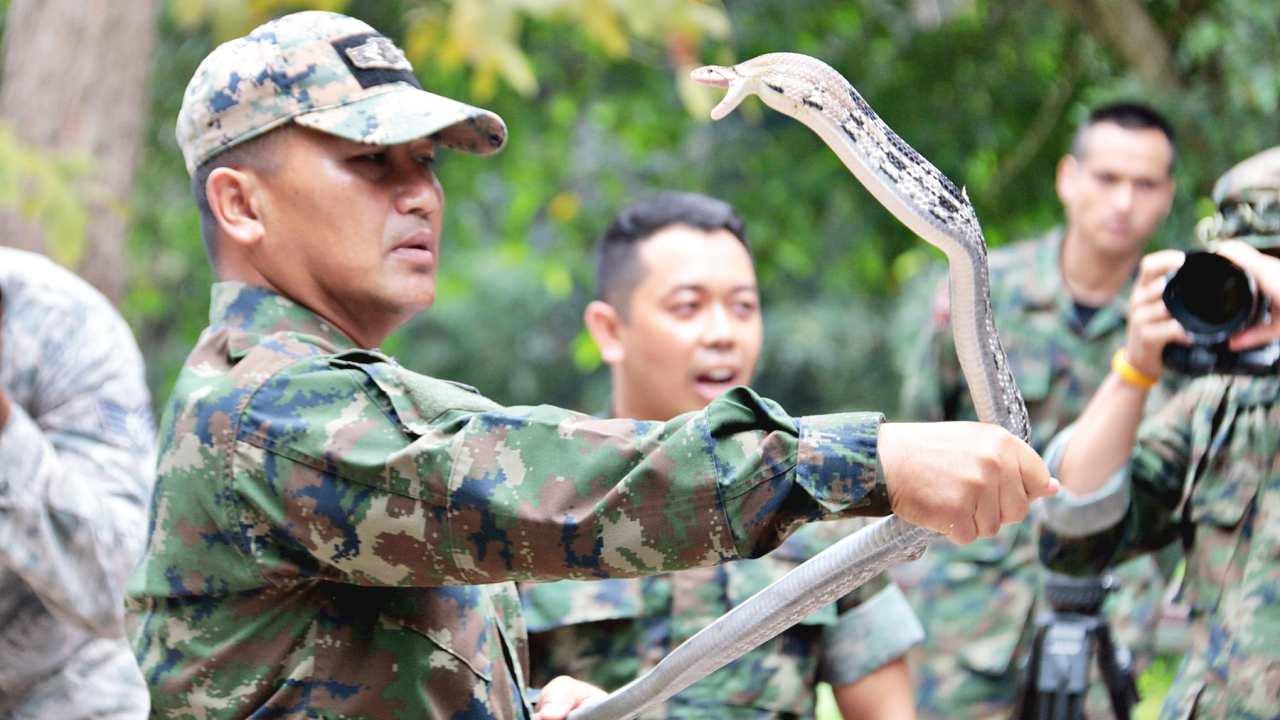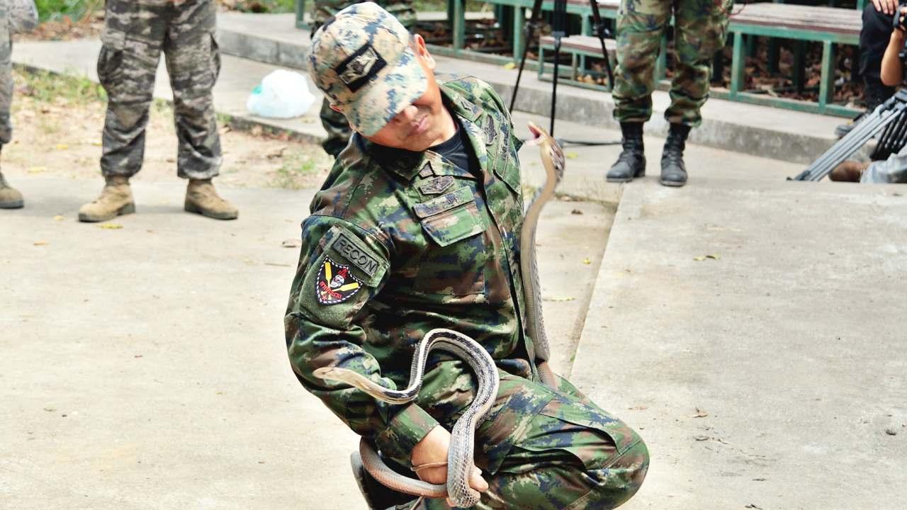 สำหรับจุดที่น่าสนใจของการฝึกดำรงชีพในป่า คือ การสาธิตการจับอสรพิษ โดยเฉพาะงูเห่า งูจงอาง ด้วยมือเปล่า รวมถึง การเชือดงู และการดื่มกินเลือดงูมีพิษอย่างสดๆ ซึ่งมีความเชื่อมาแต่สมัยโบราณว่า เลือดงูเมื่อดื่มเข้าไปจะทำปฏิกิริยาต่อร่างกาย โดยจะทำให้ระบบการหมุนเวียนของเลือดดีขึ้น จะทำให้อุณหภูมิในร่างกายอุ่น สามารถทนต่อสภาวะอากาศที่หนาวเย็นได้