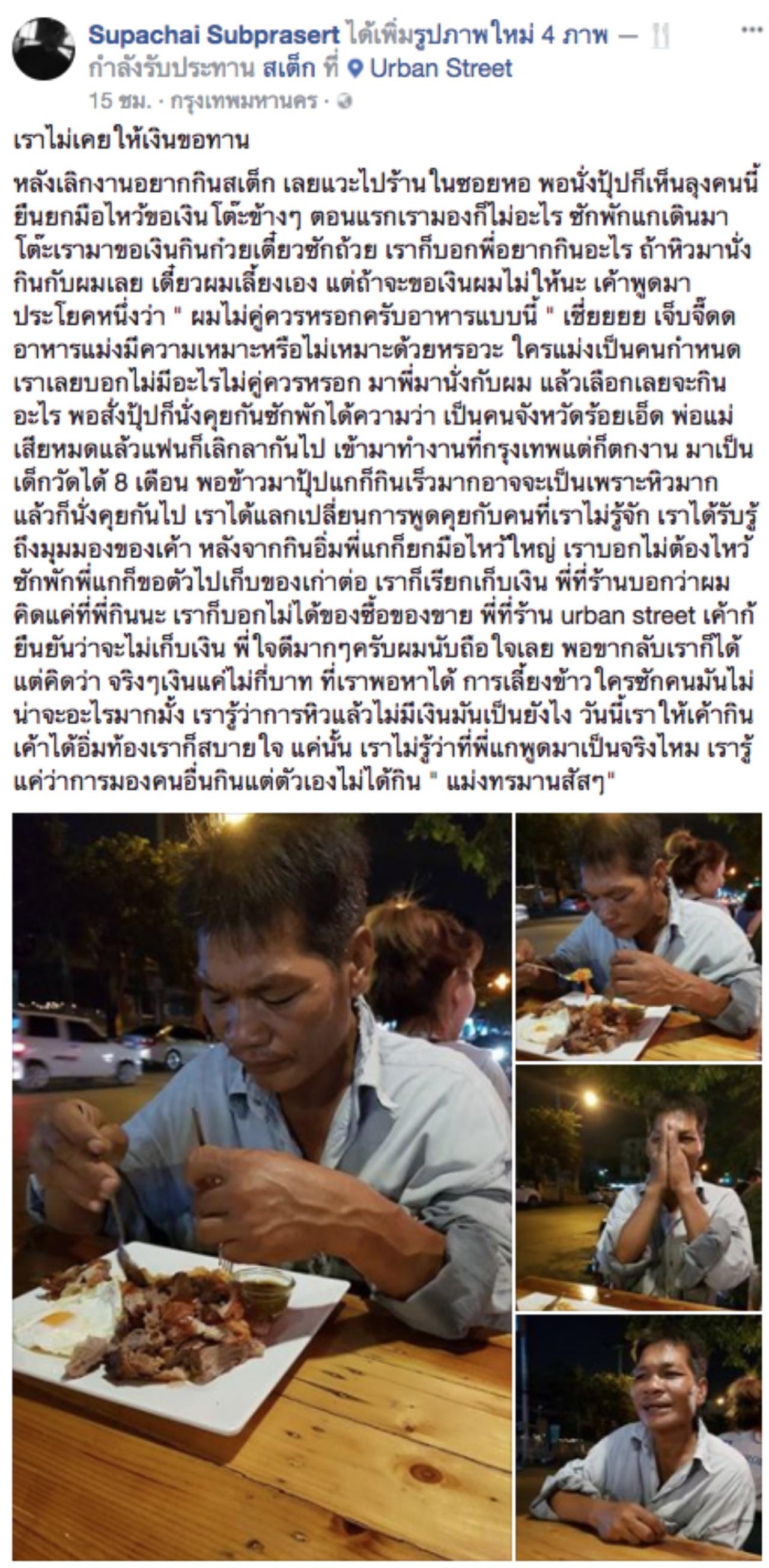 ผู้ใช้เฟซบุ๊ก Supachai Subprasert ได้เล่าเรื่องราวประทับใจหลังจากเจอชายคนหนึ่งที่เดินเข้ามาในร้านสเต๊ก ยกมือไหว้ขอเงินคนในร้านเพื่อไปซื้อก๋วยเตี๋ยว จึงชักชวนให้มานั่งกินด้วยกัน แต่ถ้าขอเป็นเงินคงไม่ให้ แต่ชายคนดังกล่าวตอบกลับมาว่า “ผมไม่คู่ควรหรอกครับอาหารแบบนี้” ตนได้ฟังก็รู้สึกเจ็บจี๊ด จึงบอกไปว่า “ไม่มีอะไรไม่คู่ควรหรอก มาพี่มานั่งกับผม แล้วเลือกเลยจะกินอะไร”