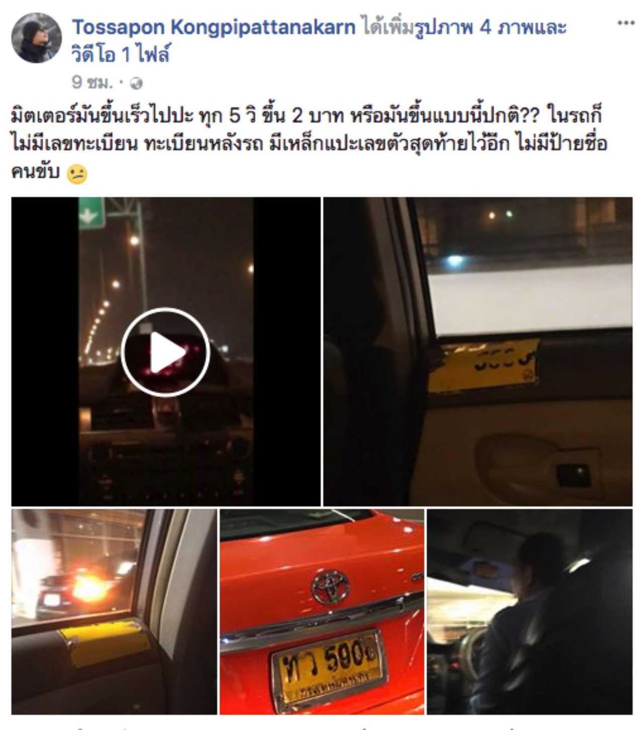 เฟซบุ๊ก Tossapon Kongpipattanakarn โพสต์คลิปวิดีโอและรูปภาพ พร้อมระบุว่า "มิเตอร์มันขึ้นเร็วไปปะ ทุก 5 วิ ขึ้น 2 บาท หรือมันขึ้นแบบนี้ปกติ?? ในรถก็ไม่มีเลขทะเบียน ทะเบียนหลังรถ มีเหล็กแปะเลขตัวสุดท้ายไว้อีก ไม่มีป้ายชื่อคนขับ"