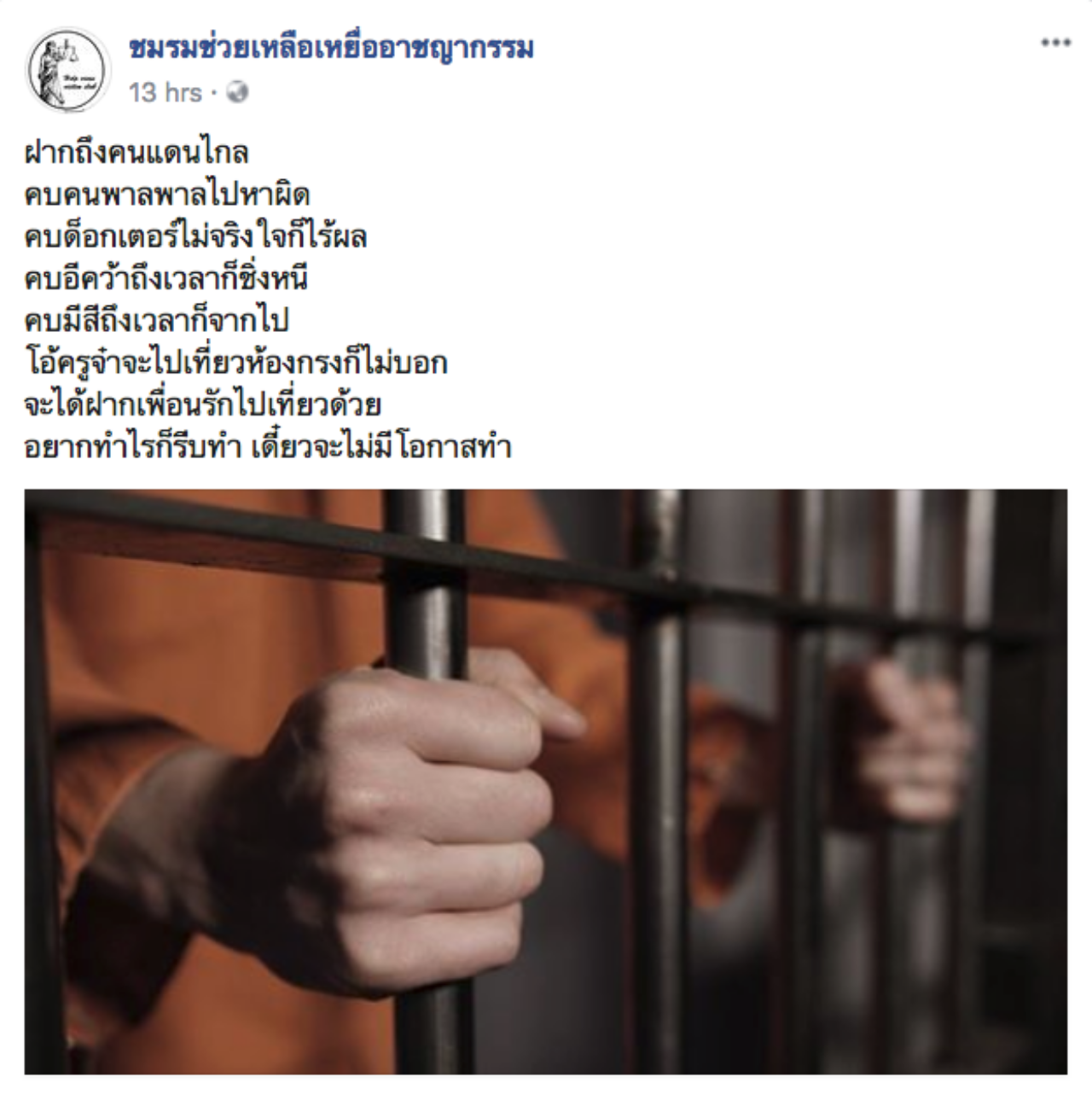 เพจชมรมช่วยเหลือเหยื่ออาชญากรรม โพสต์กลอนถึงคนแดนไกล “อยากทำไรก็รีบทำ เดี๋ยวจะไม่มีโอกาสทำ” ก่อนจะไปเที่ยวห้องกรง