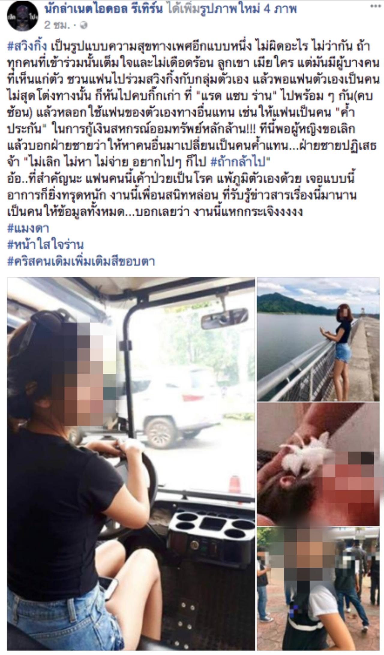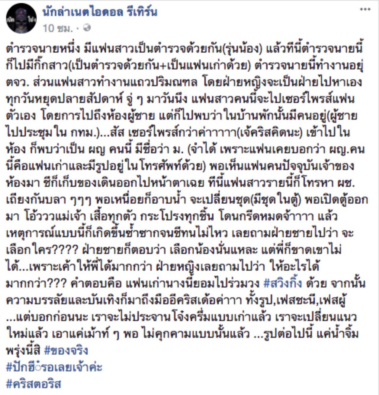 เพจ นักล่าเนตไอดอล รีเทิร์น ได้โพสต์เล่าเรื่องราวของหญิงสาวคนหนึ่ง ที่เล่าว่า ตนกับแฟนหนุ่มทำงานเป็นตำรวจแต่แฟนอยู่ต่างจังหวัด ทุกวันหยุดตนจะเป็นคนไปหา แต่มีวันหนึ่งตนอยากเซอร์ไพรส์จึงไปหาที่ห้องแต่กลับเจอเรื่องเซอร์ไพรส์กว่าเมื่อเห็นแฟนเก่าของแฟน ตนจึงโทรศัพท์ถามแฟนและมีการโต้เถียงกัน นอกจากนี้ยังพบว่าผ้าของตนที่อยู่ในตู้ถูกกรีดทุกชิ้น เหตุการณ์เช่นนี้เกิดขึ้นซ้ำซากจนทนไม่ไหวจึงถามแฟนว่าจะเลือกใคร ฝ่ายชายตอบกลับมาว่า เลือกตน แต่ก็ขาดเขาไม่ได้เพราะเขาให้มากกว่า ยอมให้ไปร่วมวงสวิงกิ้งด้วย