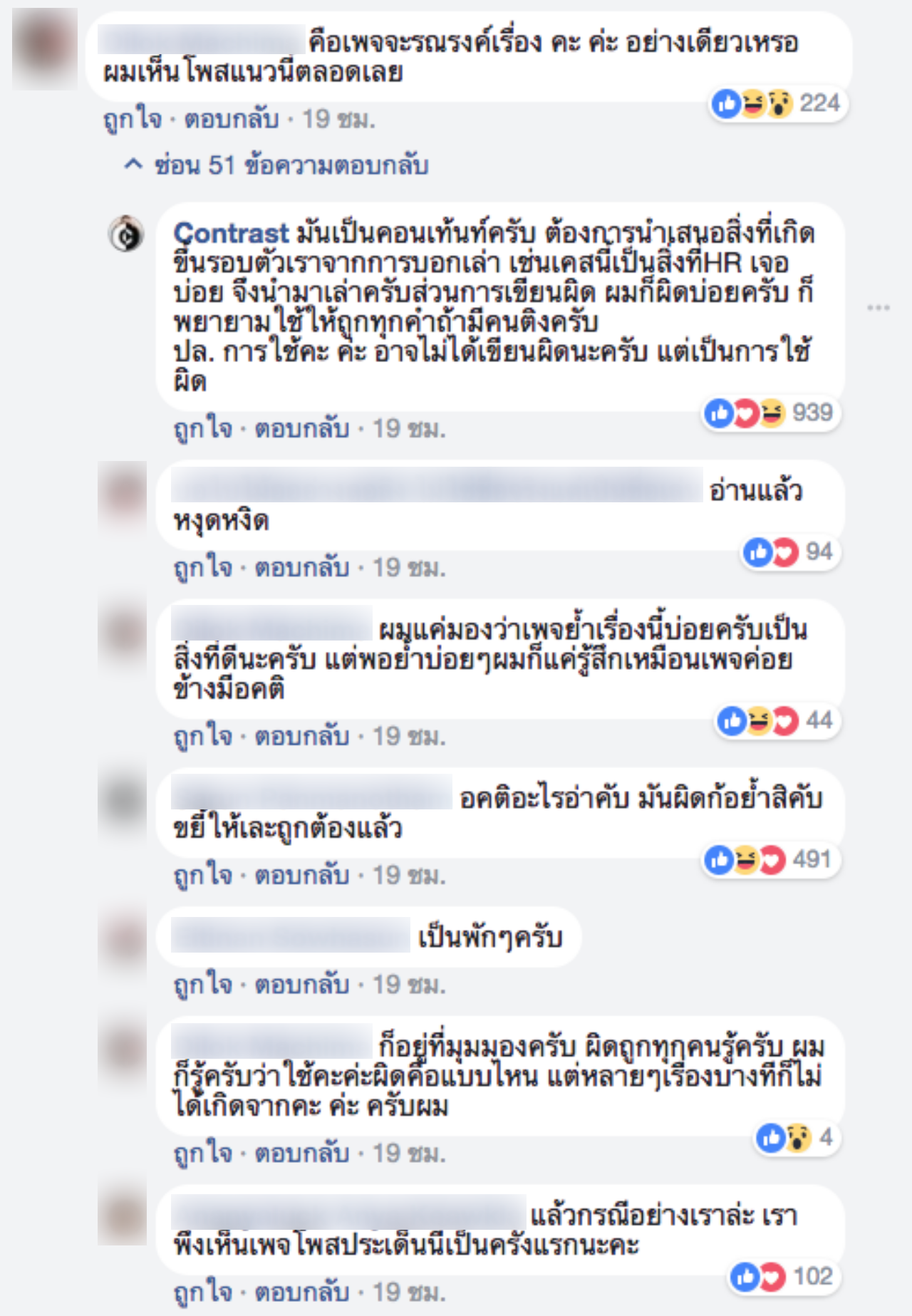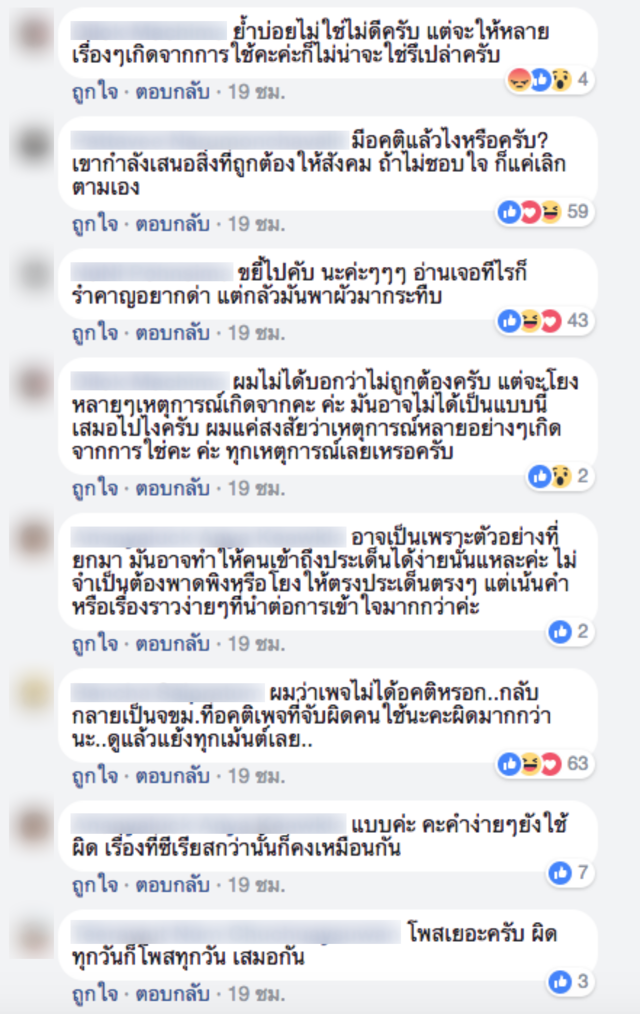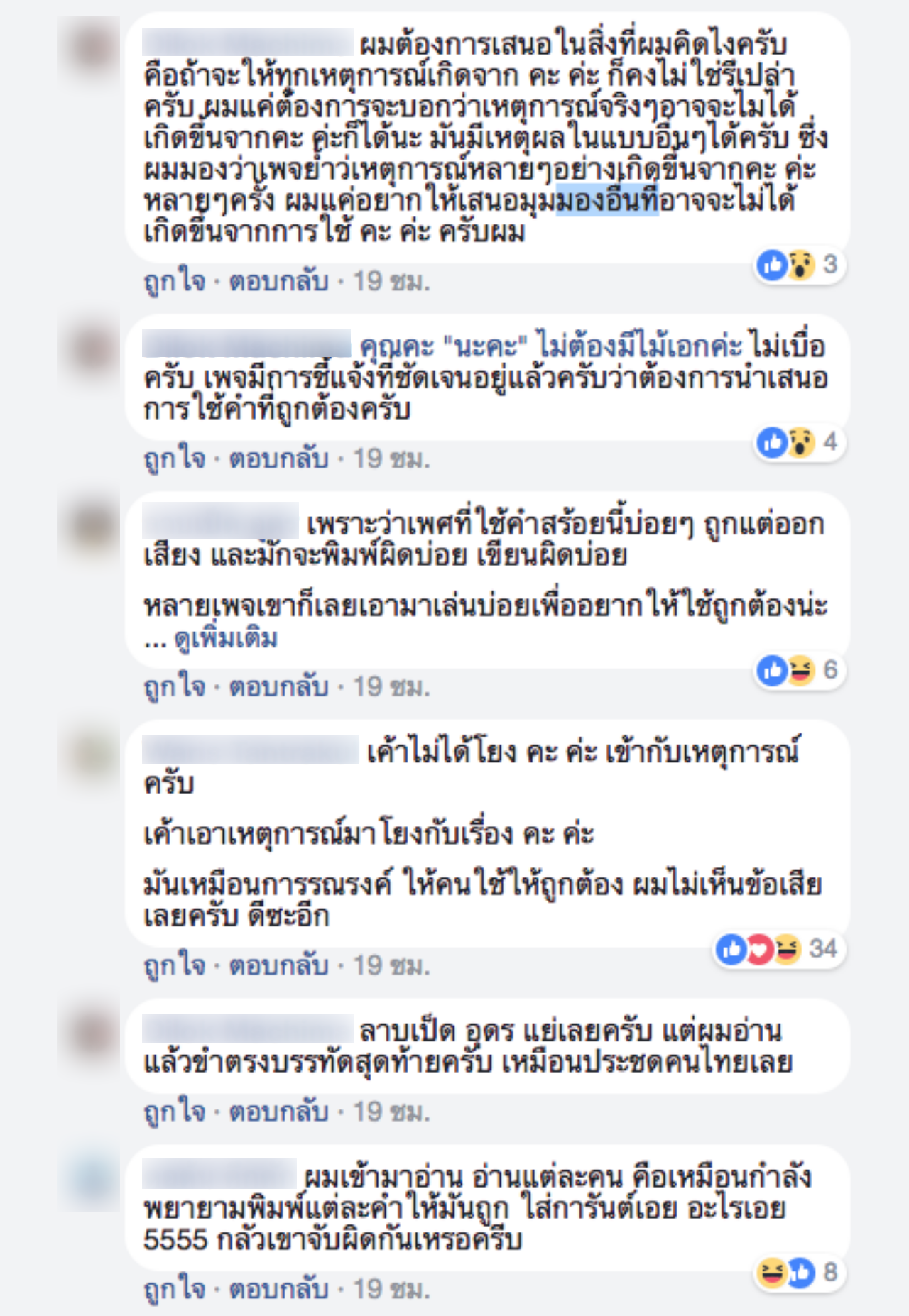 แต่ภายหลังพบว่ามีคนบางส่วนเข้ามาแสดงความคิดเห็นไม่เห็นด้วย โดยมองว่าทางเพจย้ำเรื่องนี้บ่อยเกินไป และการใช้ คำว่า "คะ ค่ะ นะคะ" ผิด ก็ไม่ได้ร้ายแรงขนาดนั้น ทำให้เกิดการโต้เถียงกันระหว่างคนที่เห็นด้วยกับทางเพจกับคนที่ไม่เห็นด้วย