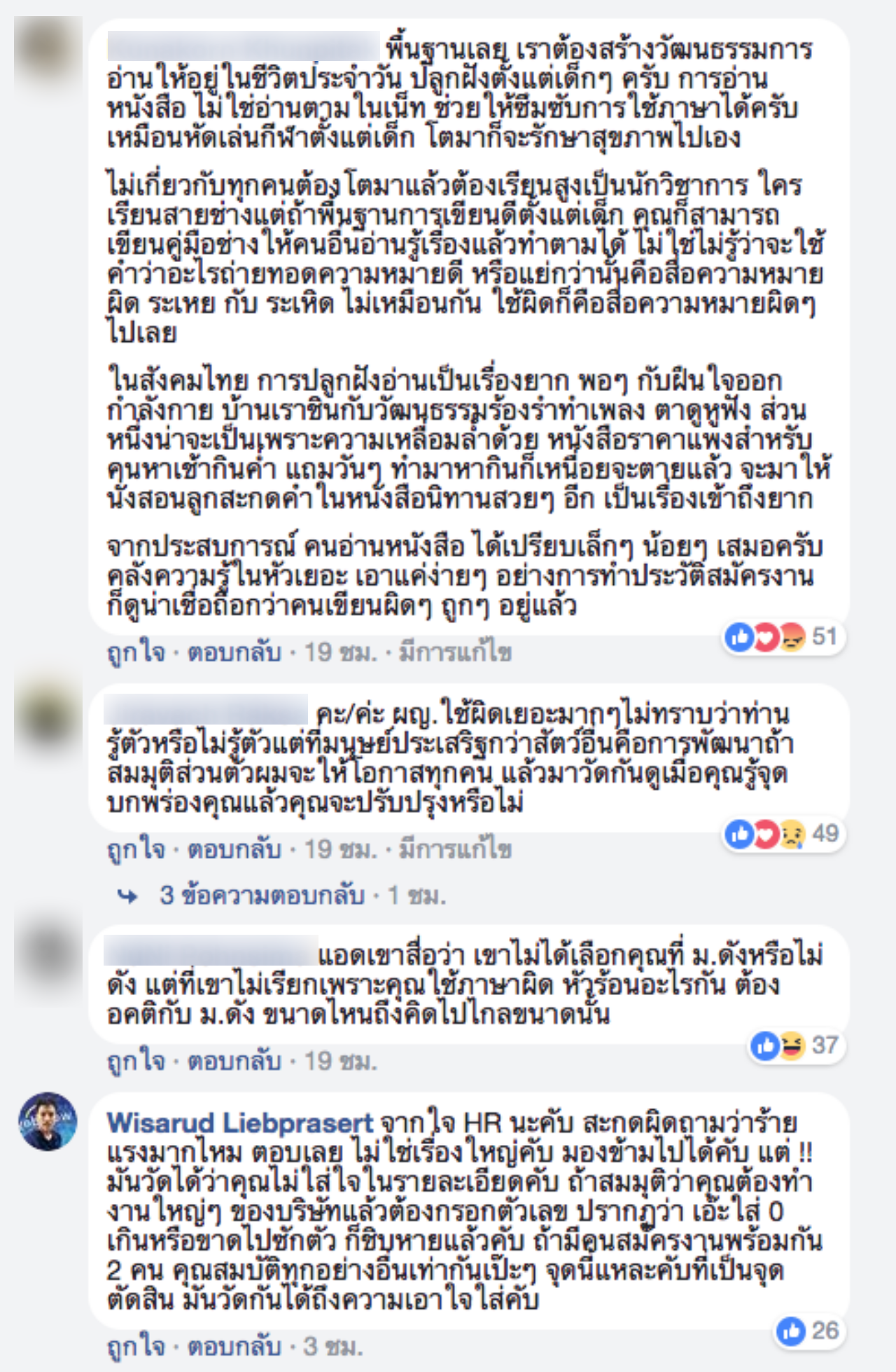 อย่างไรก็ตามได้มีผู้ใช้เฟซบุ๊ก Wisarud Liebprasert เข้ามาแสดงความคิดเห็นว่า "จากใจ HR นะครับ สะกดผิดถามว่าร้ายแรงมากไหม ตอบเลย ไม่ใช่เรื่องใหญ่ครับ มองข้ามไปได้ครับ แต่ !! มันวัดได้ว่าคุณไม่ใส่ใจในรายละเอียด ถ้าสมมติว่าคุณต้องทำงานใหญ่ๆ ของบริษัทแล้วต้องกรอกตัวเลข ปรากฏว่า เอ๊ะใส่ 0 เกินหรือขาดไปสักตัว ก็ฉิบหายแล้วครับ ถ้ามีคนสมัครงานพร้อมกัน 2 คน คุณสมบัติทุกอย่างอื่นเท่ากันเป๊ะๆ จุดนี้แหละที่เป็นจุดตัดสิน มันวัดกันได้ถึงความเอาใจใส่ครับ"