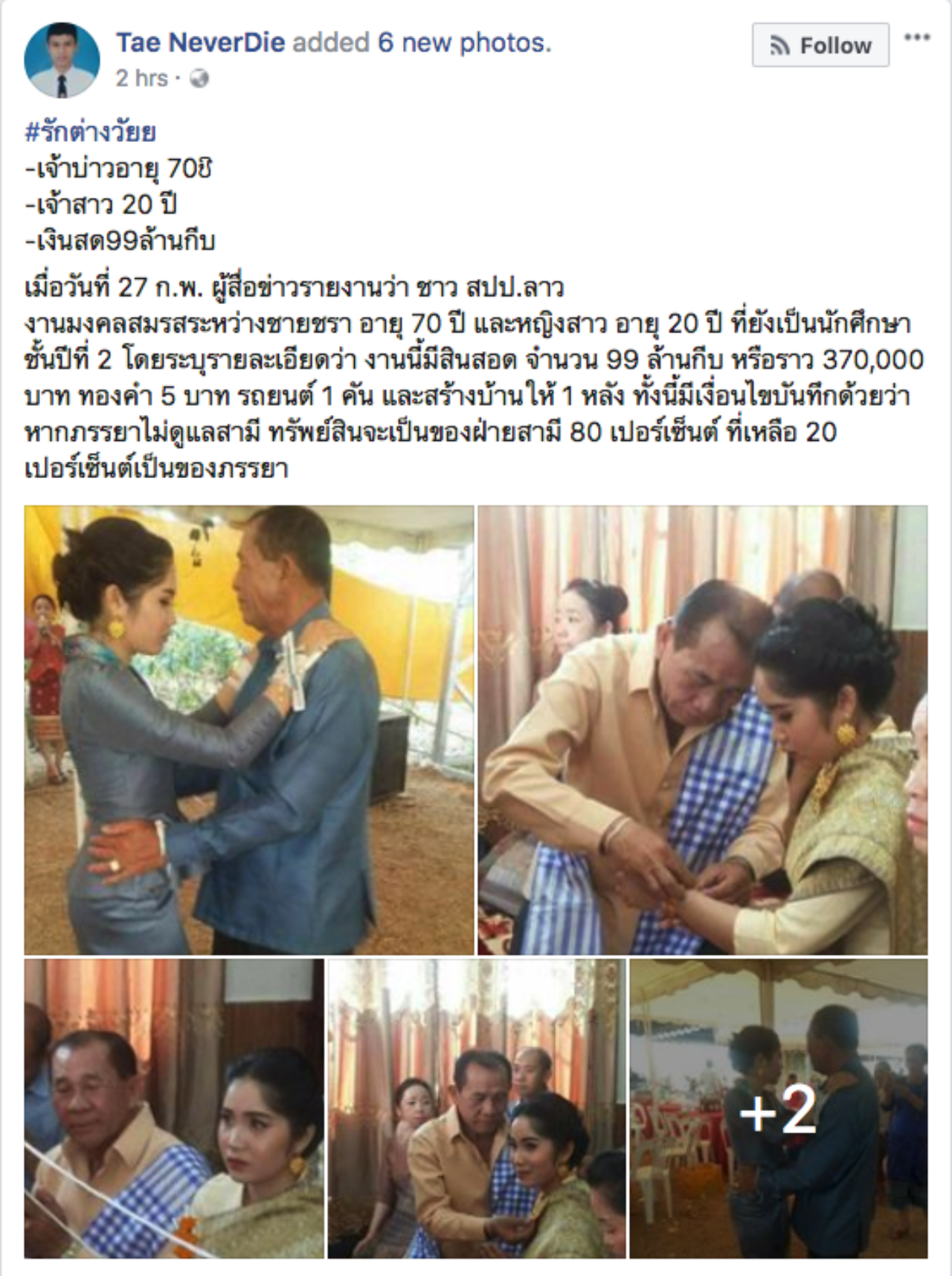 ต่อมาผู้ใช้เฟซบุ๊ก Tae NeverDie ได้นำเรื่องดังกล่าวมาแปลเป็นภาษาไทยได้ความว่าเป็นรักต่างวัย เมื่อวันที่ 27 ก.พ. มีงานมงคลสมรสระหว่างชายชราอายุ 70 ปี และหญิงสาวอายุ 20 ปี ที่ยังเป็นนักศึกษาชั้นปีที่ 2 โดยระบุรายละเอียดว่า งานนี้มีสินสอดจำนวน 99 ล้านกีบ หรือราว 370,000 บาท ทองคำ 5 บาท รถยนต์ 1 คัน และสร้างบ้านให้ 1 หลัง