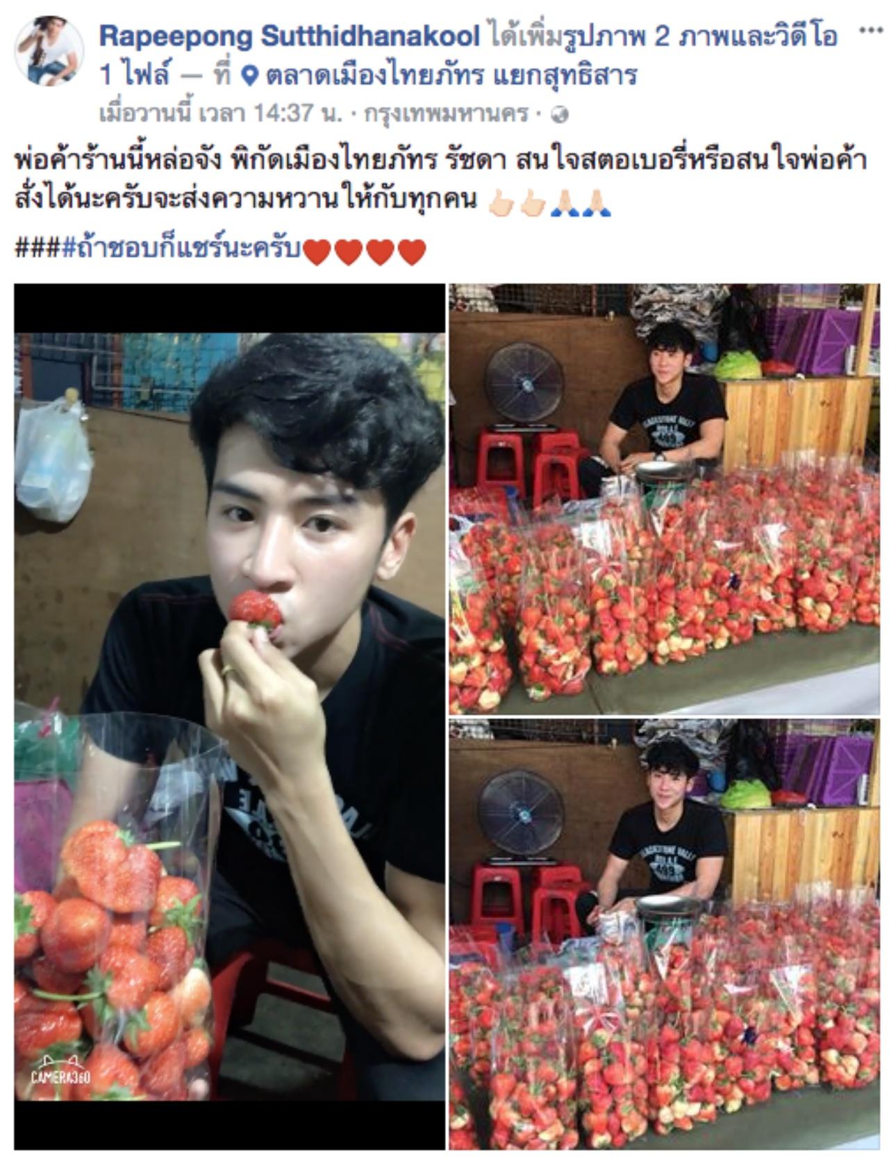 พ่อค้าแซ่บบอกต่อ พ่อค้าหล่อบอกด้วย ล่าสุด (27 ก.พ. 61) โลกออนไลน์แห่แชร์โพสต์ของผู้ใช้เฟซบุ๊ก Rapeepong Sutthidhanakool ที่ได้โพสต์คลิปวิดีโอพ่อค้าหน้าตาดีกำลังนั่งขายสตรอว์เบอร์รี่ลูกใหญ่ๆ สีแดงสด พร้อมกับระบุว่า "พ่อค้าร้านนี้หล่อจัง พิกัดเมืองไทยภัทร รัชดา สนใจสตรอว์เบอร์รี่ หรือสนใจพ่อค้า สั่งได้นะครับ จะส่งความหวานให้กับทุกคน"