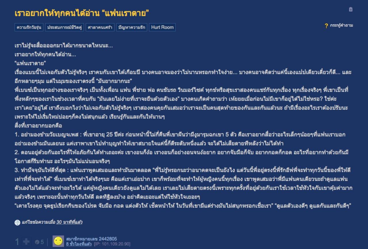 ใครไม่เจอกับตัวไม่รู้หรอก คงเป็นคำพูดที่เหมาะกับสมาชิกเว็บไซต์พันทิป 2442805 ที่ได้ตั้งกระทู้ว่า "เราอยากให้ทุกคนได้อ่าน แฟนเราตาย" โดยเล่าว่า คบกับแฟนได้เกือบปี หลายคนอาจมองว่าทำใจง่ายแต่ที่จริงแล้ว "มันยากมากนะ" เพราะเขาคือทุกอย่างทั้งเพื่อน แฟน พี่ชาย พ่อ คนขับรถ วินมอเตอร์ไซค์ จึงเป็นเรื่องไม่ง่ายเลยที่จะกลับมายืนด้วยตัวเอง