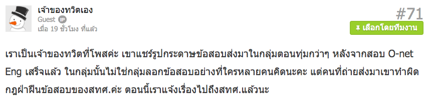 ทั้งนี้ มีผู้นำเรื่องดังกล่าวไปโพสต์ในเว็บไซต์ dek-d ซึ่งเจ้าของทวิตเตอร์เข้าไปตอบว่าเป็นคนโพสต์ต้นเรื่อง โดยได้แจ้งเรื่องดังกล่าวไปทาง สทศ. แล้ว