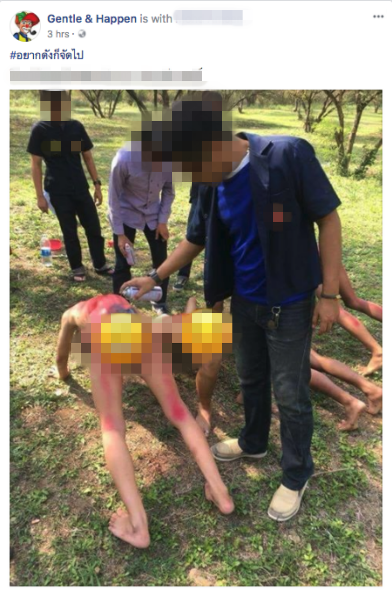 แฟนแพจเฟซบุ๊ก Gentle & Happen โพสต์ภาพการรับน้องของสถาบันการศึกษาแห่งหนึ่ง ที่รุ่นพี่กำลังพ่นสีสเปรย์บนผิวหนังของรุ่นน้อง 4 คน ที่ถูกถอดเสื้อผ้าออกหมดและทำท่าโค้งโก่งตัว และสะพานโค้งอยู่บนพื้นสนามหญ้า
