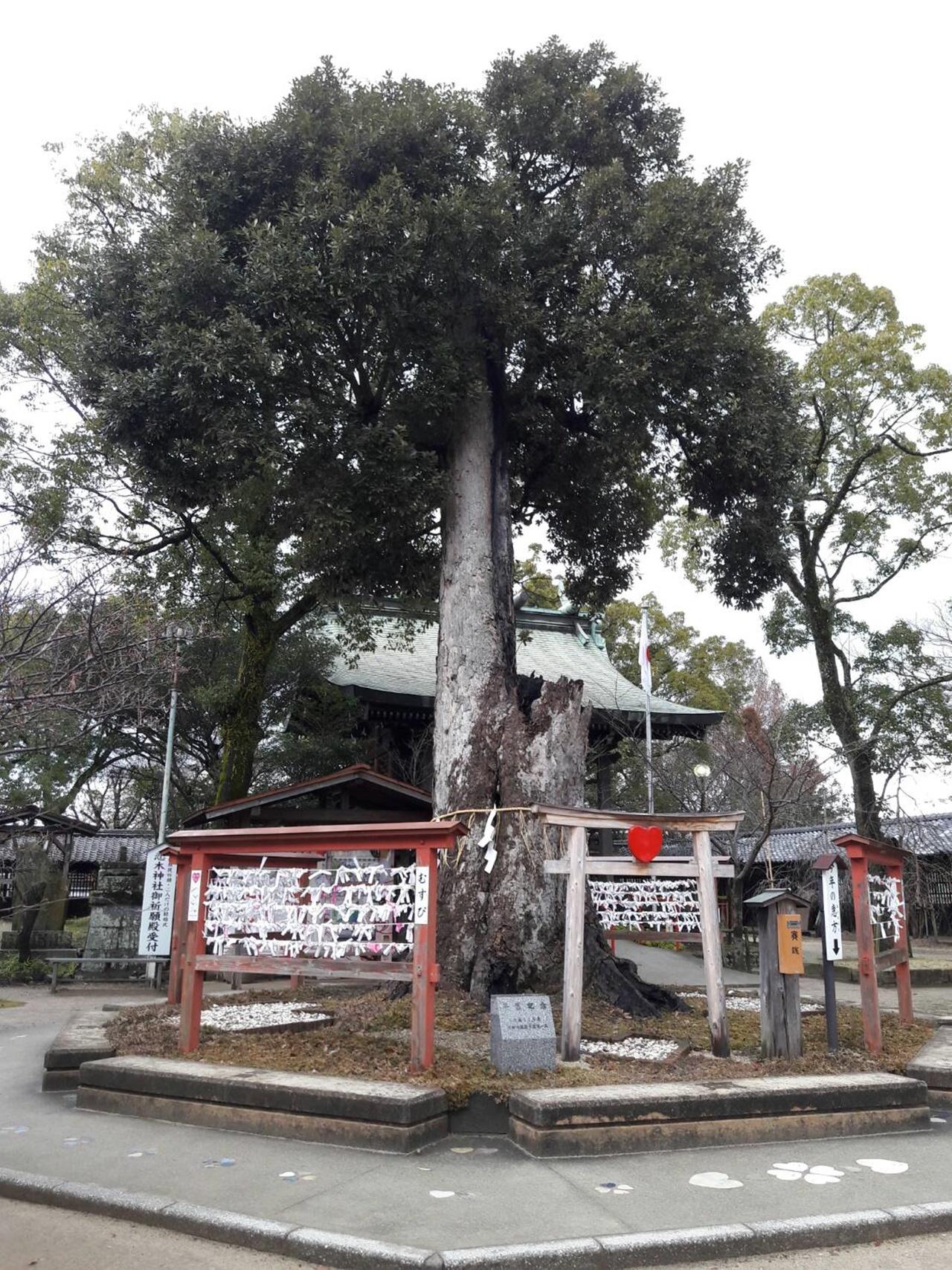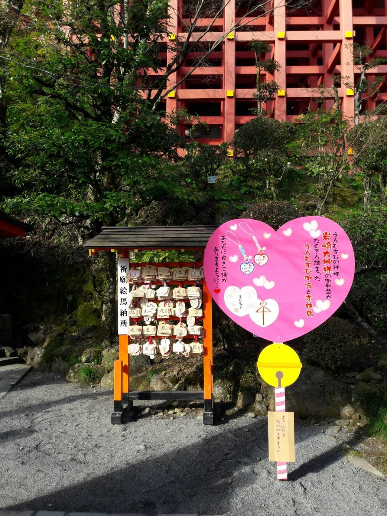 นอกจากนี้ ป้ายขอพรยังพิเศษกว่าที่อื่นคือ คนที่เขียนข้อความขอพรแล้วจะต้องพับกระดาษเป็นรูปหัวใจติดกับเชือกที่เตรียมไว้ และใกล้กับศาลเจ้าจะมีต้นไม้ขนาดใหญ่ตั้งอยู่ มีความเชื่อว่าคนที่มาขอพรต้องเดินวนต้นไม้แล้วจะสมหวังในความรักอีกด้วย