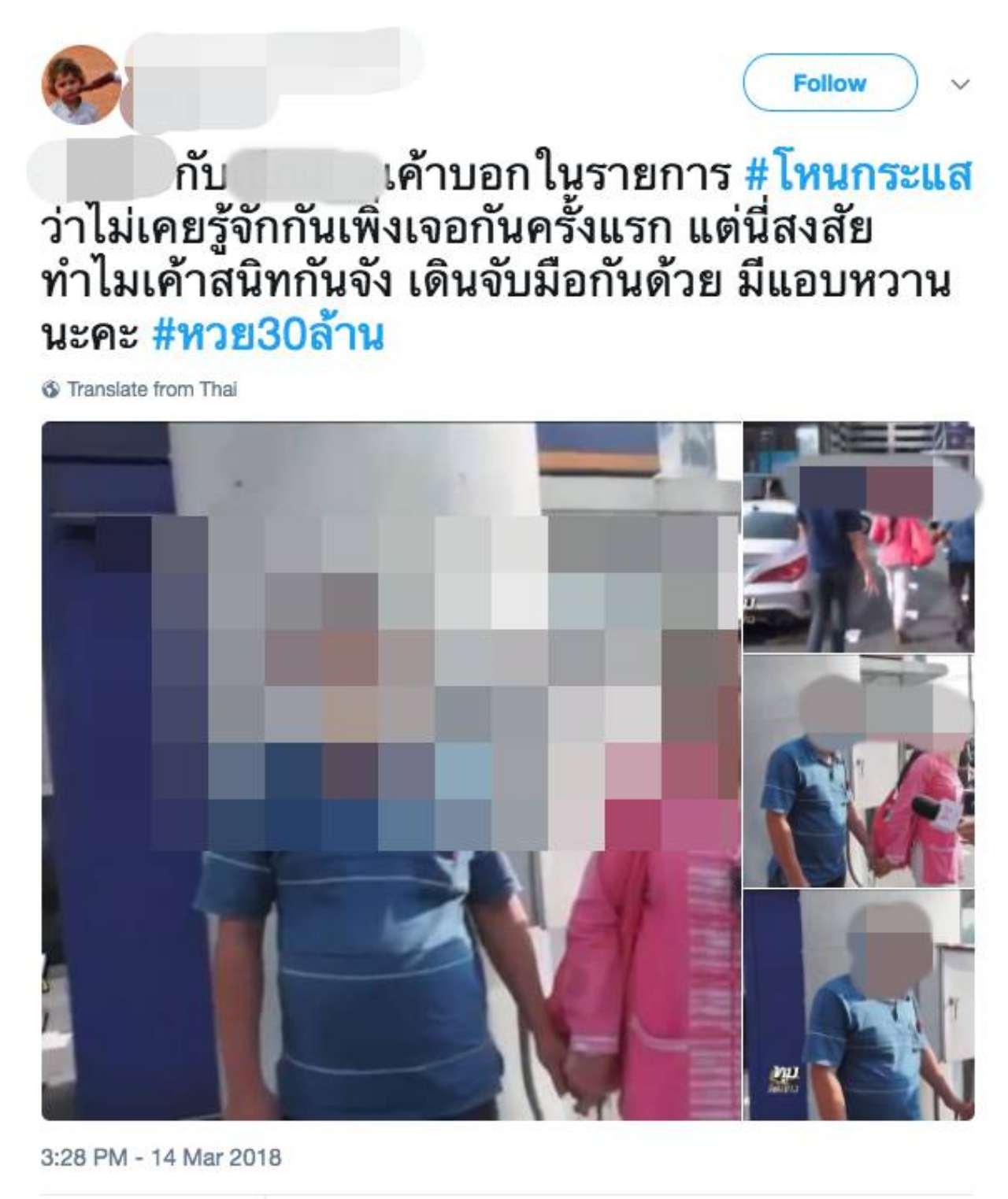 อย่างไรก็ตาม ชาวโซเชียลทั้งในทวิตเตอร์ และเฟซบุ๊ก ได้แคปภาพจากช่องข่าวแห่งหนึ่ง ซึ่งเป็นรูปแผน กับสาวปริศนา ที่น่าจะเกี่ยวข้องกับคดีหวย 30 ล้าน ซึ่งชาวเน็ตระบุว่า ทั้งคู่ให้สัมภาษณ์ในรายการหนึ่งว่า ไม่เคยรู้จักกันมาก่อน แต่ภาพที่แสดงให้เห็นพบว่า น่าจะรู้จักกันเป็นอย่างดี