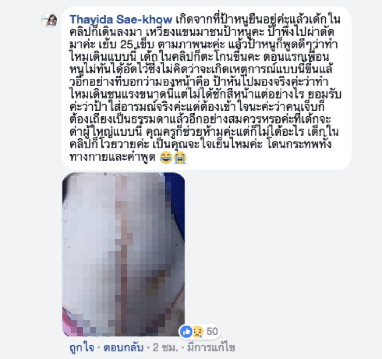 ต่อมามีผู้ใช้เฟซบุ๊ก Thayida Sae-khow ระบุเพิ่มเติมว่า ป้าของตนยืนอยู่แล้วเด็กในคลิปเดินลงมา เหวี่ยงแขนมาชนป้าที่เพิ่งผ่าตัด เย็บ 25 เข็ม ซึ่งป้าหนูก็พูดดีๆ ว่า "ทำไมเดินแบบนี้" แต่เด็กในคลิปกลับตะโกนขึ้น ซึ่งคลิปไม่ได้อัดไว้ตั้งแต่ต้นเพราะไม่คิดว่าจะเกิดเหตุการณ์แบบนี้ ส่วนที่เด็กบอกว่าป้าหันไปมอง ยอมรับว่ามองจริงแต่ไม่ได้ชักสีหน้า และที่ป้าใส่อารมณ์ก็ต้องเข้าใจว่าคนเจ็บต้องเถียงเป็นธรรมดา คุณครูก็ช่วยห้ามแต่ก็ไม่ได้อะไร