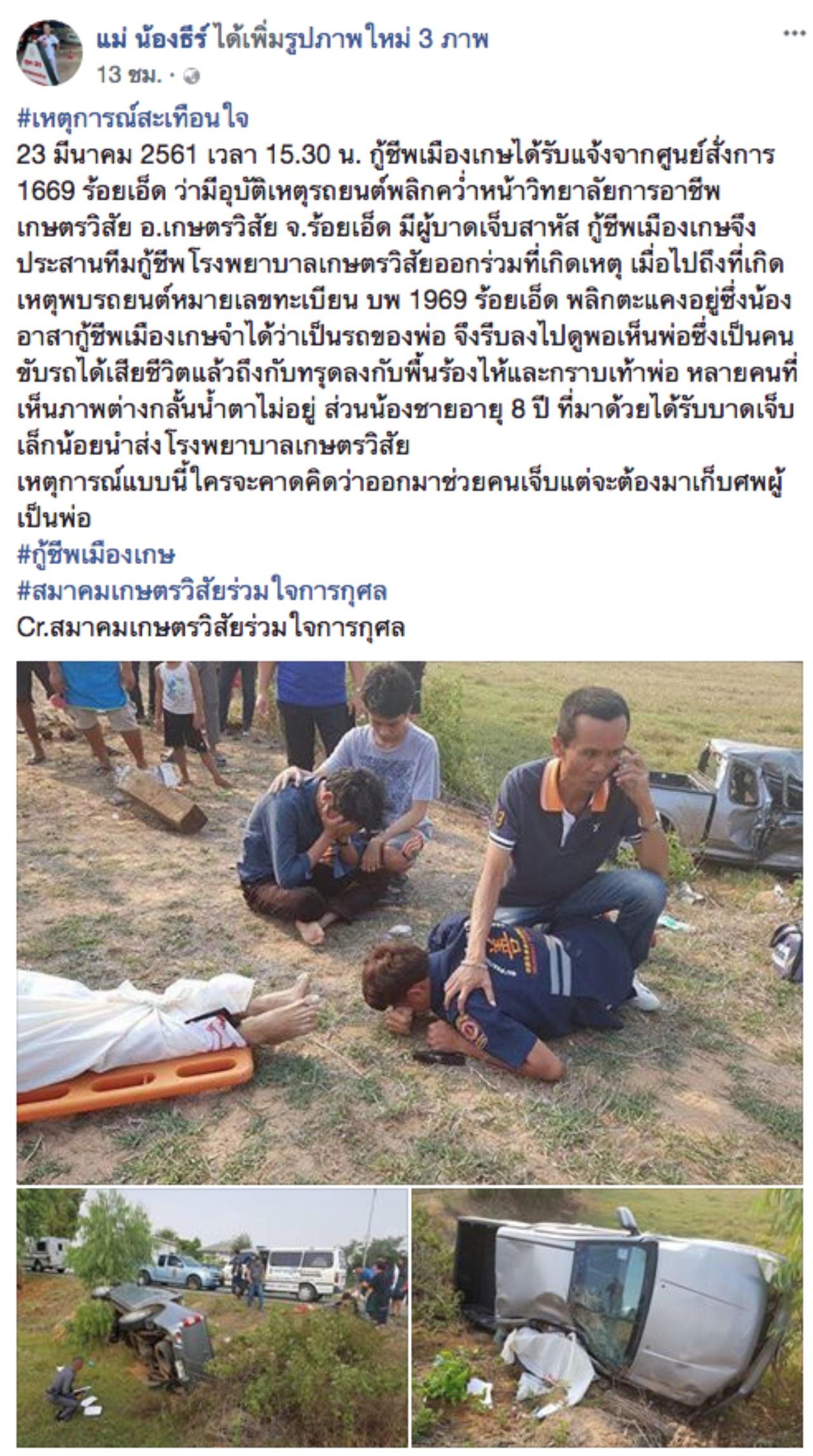"น้องอาสากู้ชีพเมืองเกษจำได้ว่าเป็นรถของพ่อ จึงรีบลงไปดูพอเห็นพ่อซึ่งเป็นคนขับรถได้เสียชีวิตแล้วถึงกับทรุดลงกับพื้นร้องไห้และกราบเท้าพ่อ หลายคนที่เห็นภาพต่างกลั้นน้ำตาไม่อยู่ ส่วนน้องชายอายุ 8 ปี ที่มาด้วยได้รับบาดเจ็บเล็กน้อยนำส่งโรงพยาบาลเกษตรวิสัย เหตุการณ์แบบนี้ใครจะคาดคิดว่าออกมาช่วยคนเจ็บแต่จะต้องมาเก็บศพผู้เป็นพ่อ"
