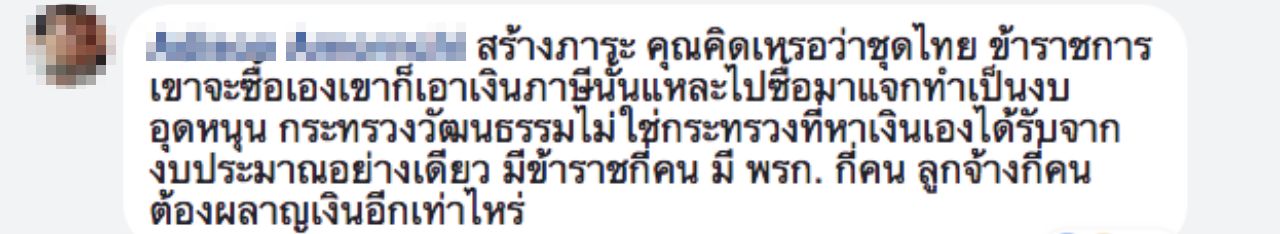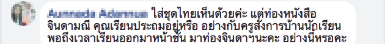 รวมทั้ง แสดงความคิดเห็นว่า การใส่ชุดไทยเห็นด้วย แต่ท่องหนังสือจินดามณี คุณเรียนประถมอยู่เหรอ อย่างกับครูสั่งการบ้านนักเรียน พอถึงเวลาเรียนออกมาหน้าชั้น มาท่องบทจินดามณี แบบนี้เหรอ