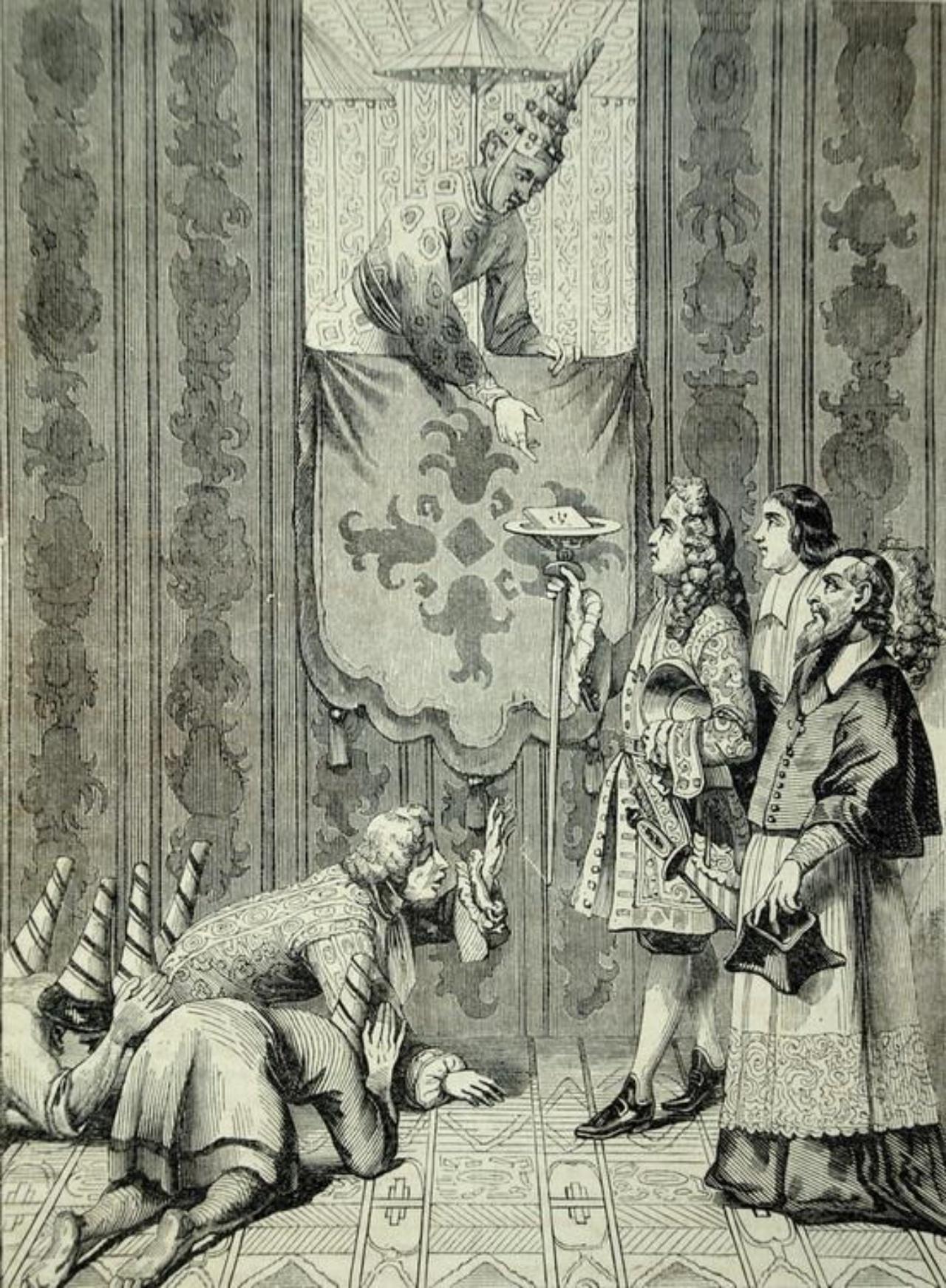 เราจะเห็นบาทหลวงยืนอยู่ด้านหลังท่านราชทูตคือ บาทหลวงอับเบ เดอ ชัวซีย์ ถัดมาด้านซ้ายมือของท่านราชทูตคือ สังฆราชเมเตลโลโปลิส (หลุยส์ ลาโน) เจ้าคณะมิสซังต่างประเทศประจำกรุงศรีอยุธยาองค์แรก (คนสยามเรียก พระธรรมสาคร) ซึ่งเป็นล่ามแปลภาษาฝรั่งเศสเป็นโปรตุเกส แล้วให้ฟอลคอนแปลจากโปรตุเกสเป็นภาษาไทยอีกที
