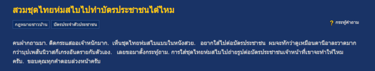 ทั้งนี้ ผู้ใช้เฟซบุ๊ก Numfon Sinchai โพสต์ตอบคำถามกระทู้ดังกล่าว พร้อมระบุข้อความว่า สามารถสวมชุดไทยห่มสไบไปทำบัตรประชาชนได้ จัดเต็มได้เลย เพราะบัตรใบหนึ่งต้องอยู่กับเรา 7 ปี แต่ชุดไทยต้องปิดไหล่นะคะ.