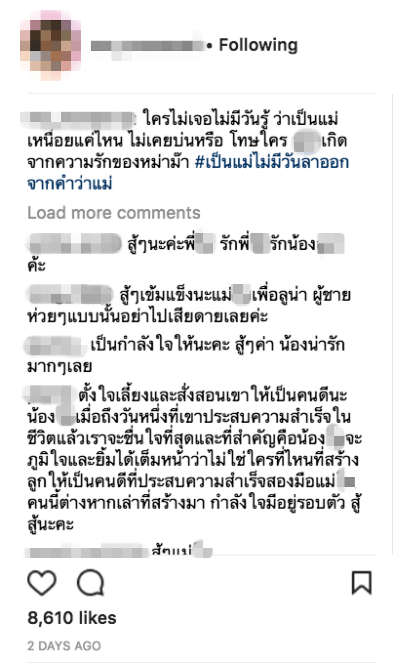 ทั้งนี้ ในโพสต์ 2 วันก่อนหน้า เจ้าตัวก็ได้โพสต์ภาพพร้อมแคปชั่นว่า “ใครไม่เจอไม่มีวันรู้ ว่าเป็นแม่เหนื่อยแค่ไหน ไม่เคยบ่นหรือโทษใคร ลูกเกิดจากความรักของหม่าม๊า #เป็นแม่ไม่มีวันลาออกจากคำว่าแม่” งานนี้มีชาวโซเชียลเข้ามาให้กำลังใจคุณแม่รายนี้อย่างมากมาย.