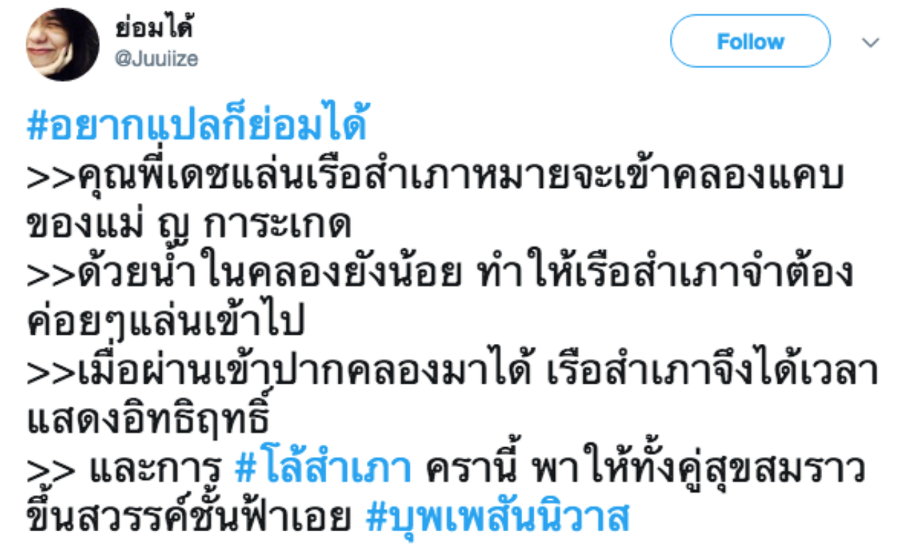 ขณะที่ ผู้ใช้ทวิตเตอร์ ย่อมได้ ได้แปลความหมายจากกลอนดังกล่าว ระบุว่า คุณพี่เดชแล่นเรือสำเภาหมายจะเข้าคลองแคบของแม่หญิง การะเกด ด้วยน้ำในคลองยังน้อย ทำให้เรือสำเภาจำต้องค่อยๆ แล่นเข้าไป เมื่อผ่านเข้าปากคลองมาได้ เรือสำเภาจึงได้เวลาแสดงอิทธิฤทธิ์ และการโล้สำเภา ครานี้ พาให้ทั้งคู่สุขสมราวขึ้นสวรรค์ชั้นฟ้า.