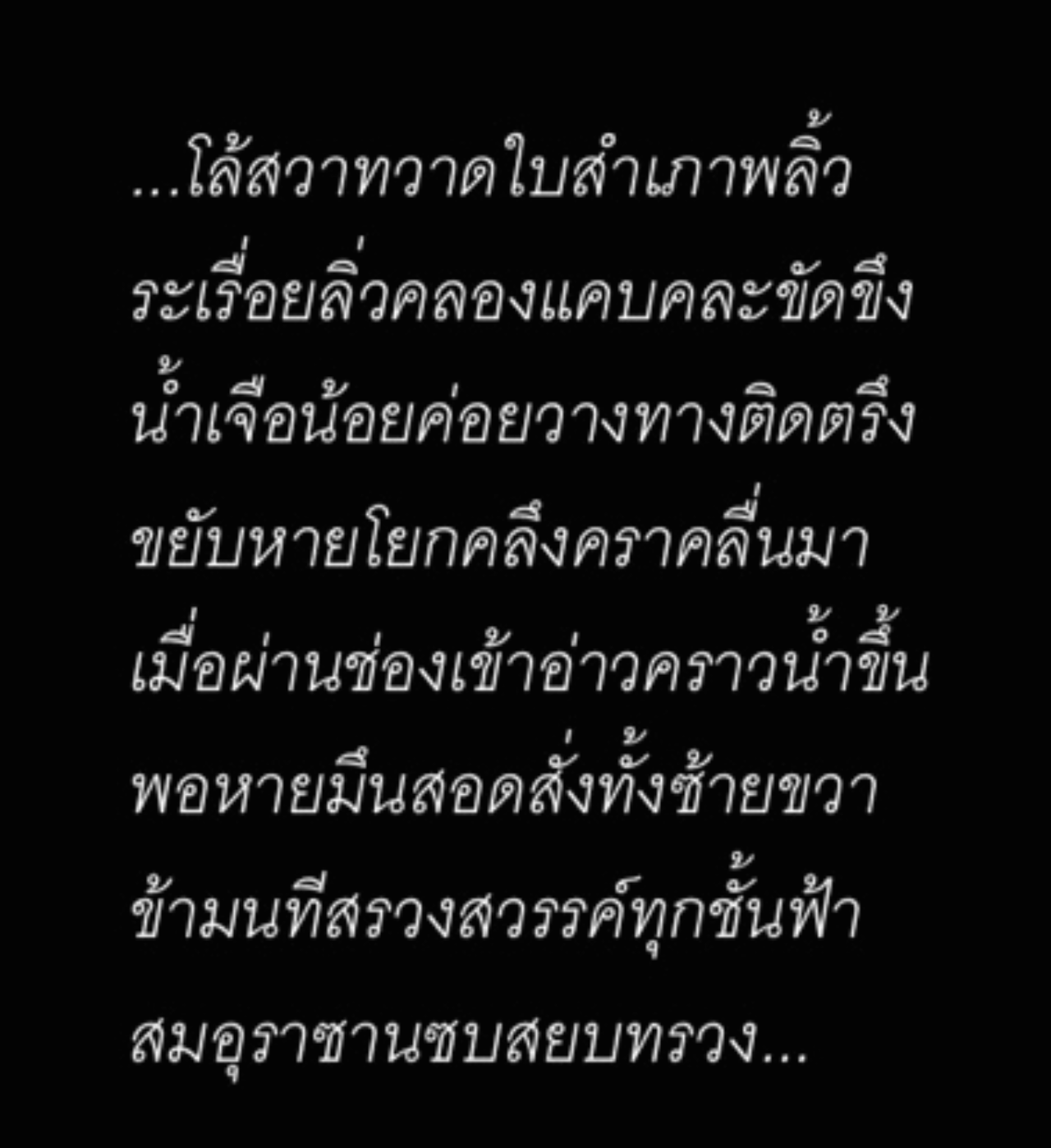 “กระนั้นฤา... มาเถิดพี่จักสอนให้” ทั้งสองล้มตัวลงนอนคลอเคลียมีความสุข