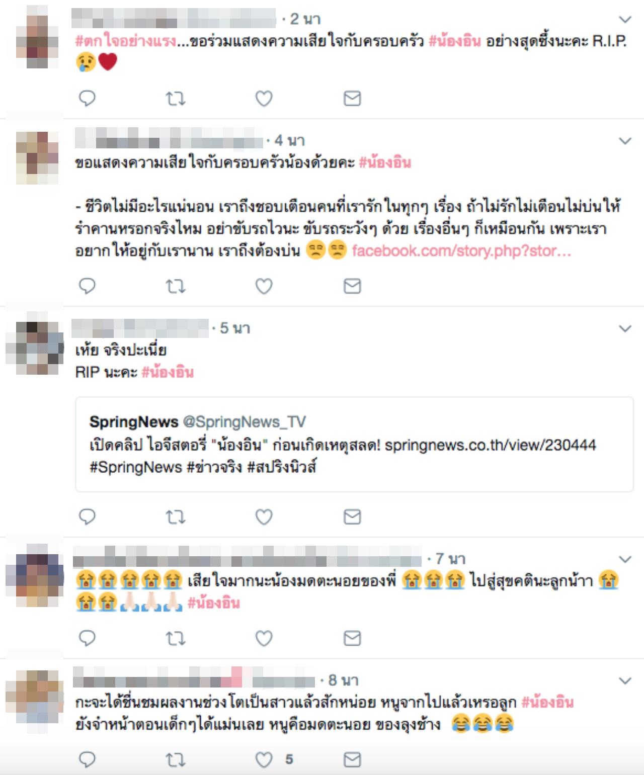 แฟนคลับแห่แสดงความเสียใจต่อครอบครัว "น้องอิน" ณัฐนิชา เชิดชูบุพการี อดีตดาราเด็กชื่อดัง ขับ BMW ชนต้นไม้เสียชีวิต พร้อมติดแฮชแท็กแสดงความอาลัย...