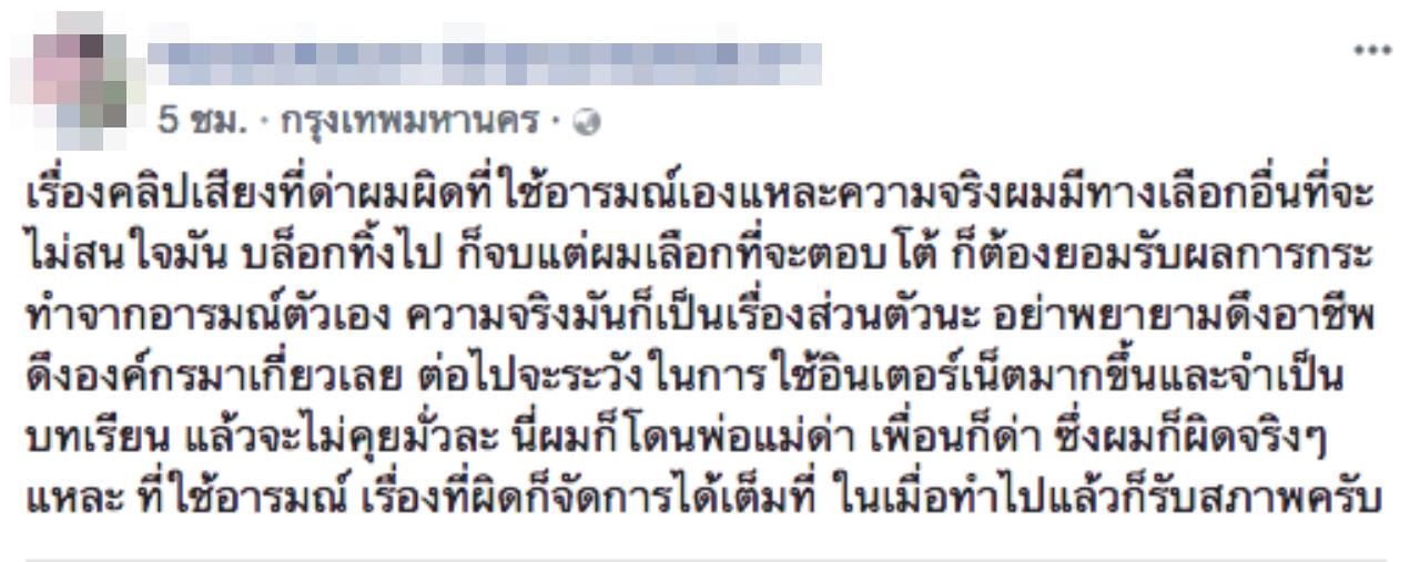 ล่าสุด (20 เม.ย.61) มีรายงานว่า ชายในคลิปเสียงเป็นเจ้าหน้าที่ตำรวจ และได้โพสต์ขอโทษถึงเรื่องดังกล่าวผ่านเฟซบุ๊กส่วนตัว โดยระบุว่า "เรื่องคลิปเสียงที่ด่า ผมผิดที่ใช้อารมณ์เอง ความจริงผมมีทางเลือกอื่นที่จะไม่สนใจมัน บล็อกทิ้งไปก็จบ แต่ผมเลือกที่จะตอบโต้ ก็ต้องยอมรับผลการกระทำจากอารมณ์ตัวเอง ความจริงมันก็เป็นเรื่องส่วนตัวนะ อย่าพยายามดึงอาชีพ ดึงองค์กรมาเกี่ยวเลย ต่อไปจะระวังในการใช้อินเทอร์เน็ตมากขึ้นและจำเป็นบทเรียน แล้วจะไม่คุยมั่วละ นี่ผมก็โดนพ่อแม่ด่า เพื่อนก็ด่า ซึ่งผมก็ผิดจริงๆ แหละที่ใช้อารมณ์ เรื่องที่ผิดก็จัดการได้เต็มที่ ในเมื่อทำไปแล้วก็รับสภาพครับ".