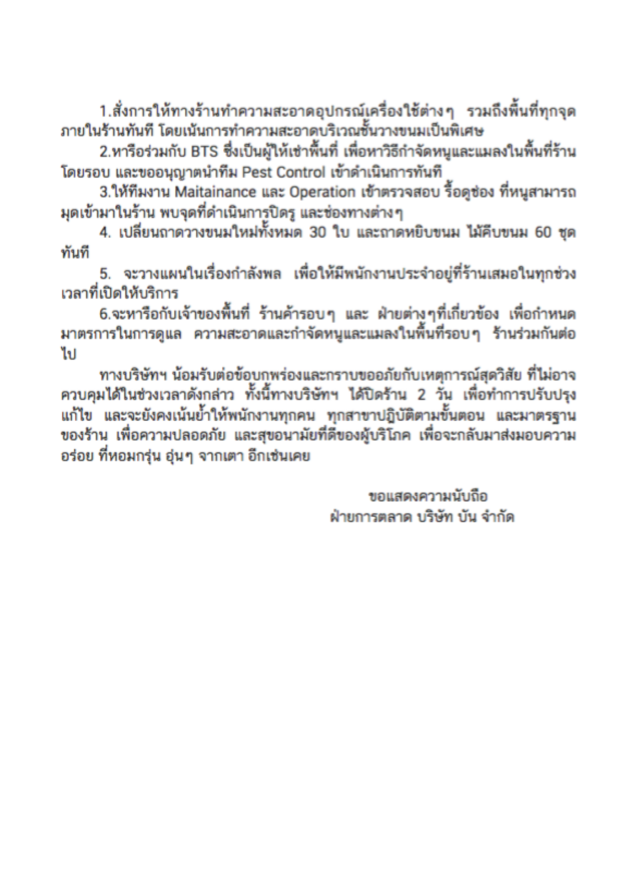 บริษัท บัน ออกเอกสารชี้แจงกรณีคลิปพบหนูกัดแทะขนมปังในร้านสาขา BTS ศาลาแดง เผย เป็นช่วงที่พนักงานไปห้องน้ำ ยันยึดความสะอาด มีมาตรฐาน สั่งปิด 2 วันบิ๊กคลีนนิ่ง เปลี่ยนอุปกรณ์ทั้งหมด
