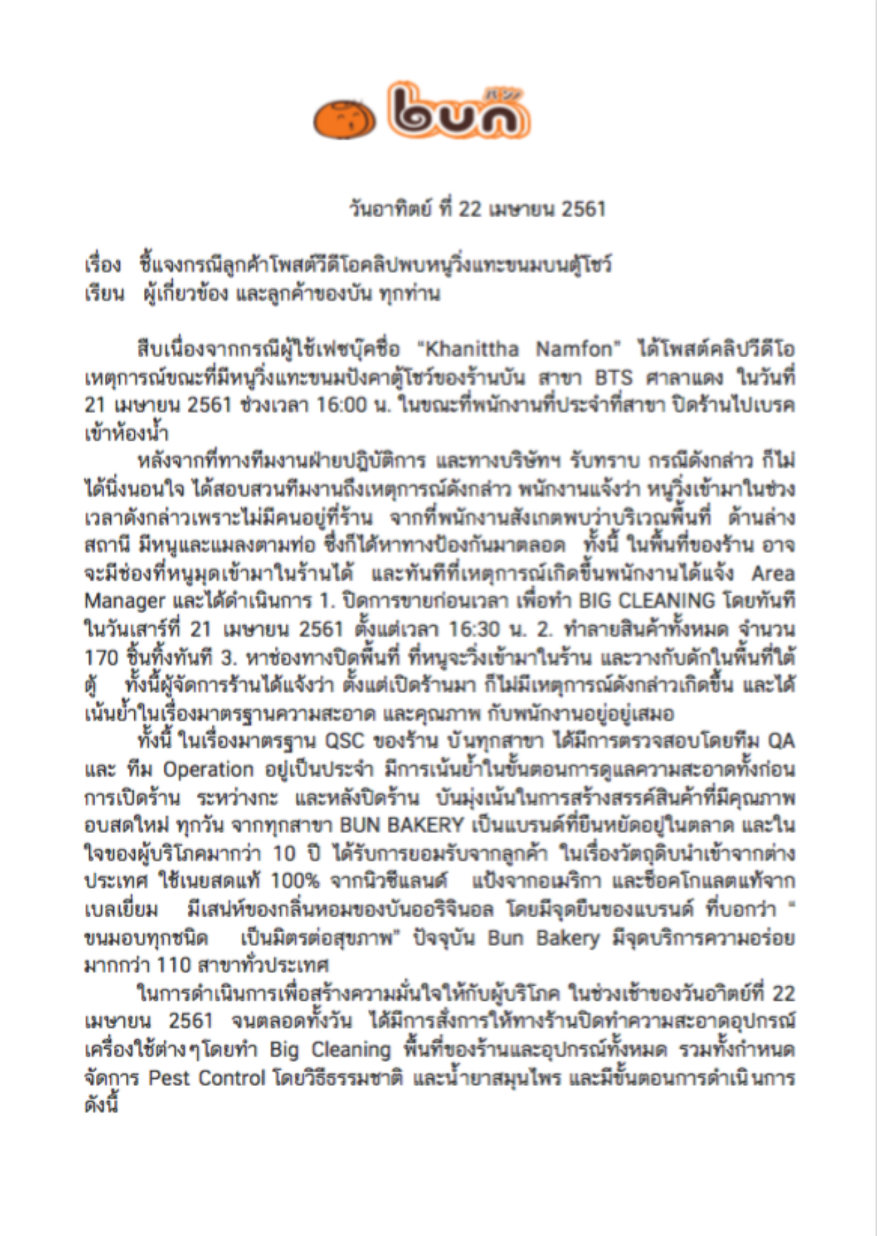 บริษัท บัน จํากัด ชี้แจงกรณีผู้ใช้เฟซบุ๊กช่ือ “Khanittha Namfon” โพสต์คลิปวิดีโอเหตุการณ์หนูวิ่งแทะขนมปังคาตู้โชว์ของร้านบัน สาขา BTS ศาลาแดง ในวันที่ 21 เมษายน 2561 ช่วงเวลา 16.00 น. ในขณะที่พนักงานที่ประจําที่สาขาปิดร้านไปเข้าห้องน้ำ