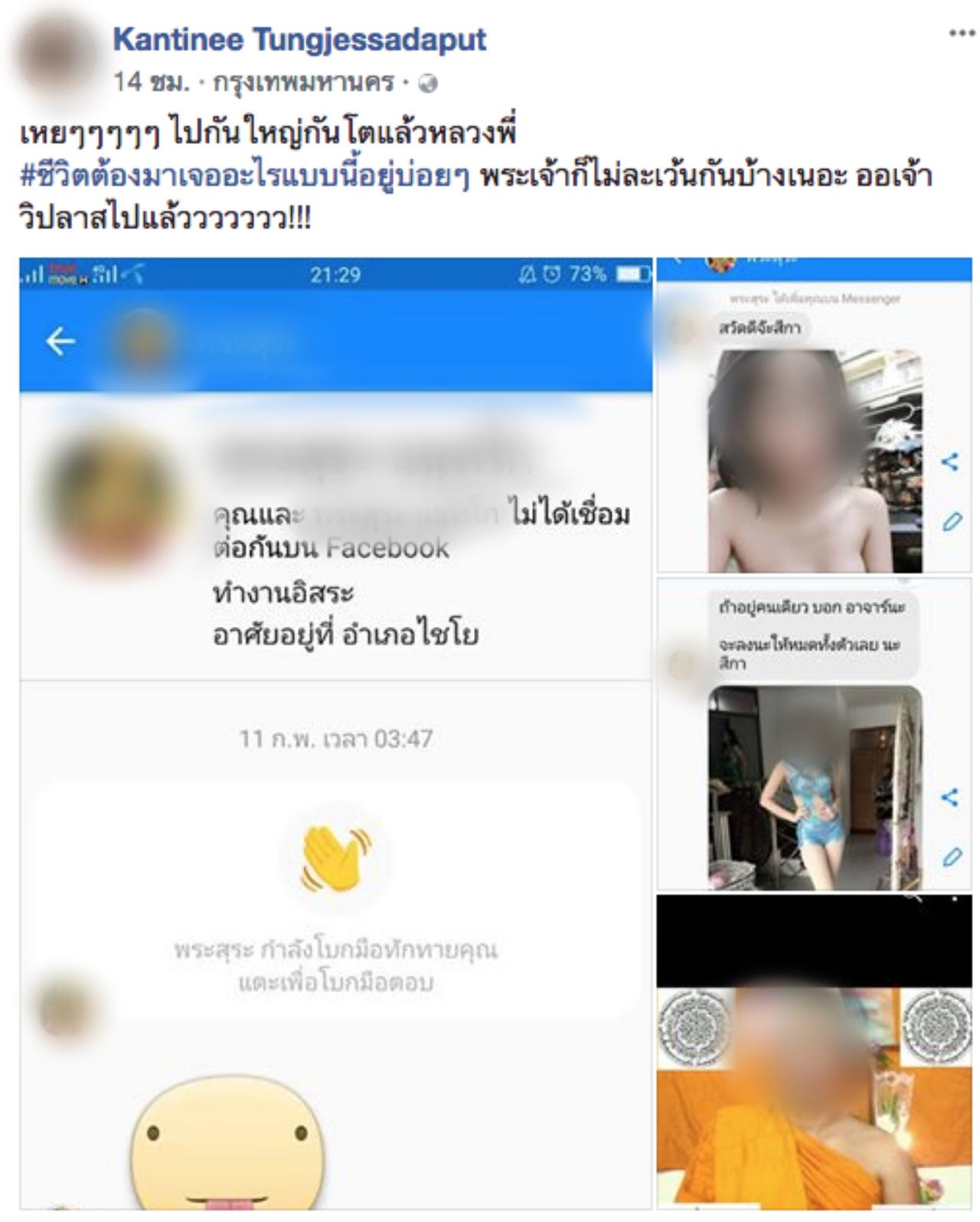 ผู้ใช้เฟซบุ๊ก Kantinee Tungjessadaput ได้โพสต์ภาพที่แคปจากห้องแชต หลังจากมีผู้ใช้เฟซบุ๊กที่อ้างว่าเป็นพระทักมาบอกว่า เป็นคนมีเสน่ห์แต่เรื่องของความรักต้องเสริมเสน่หาอีกหน่อย และยังบอกอีกว่า ถ้าอยู่คนเดียวบอกอาจารย์นะ จะลงนะให้ทั้งตัวเลยสีกา