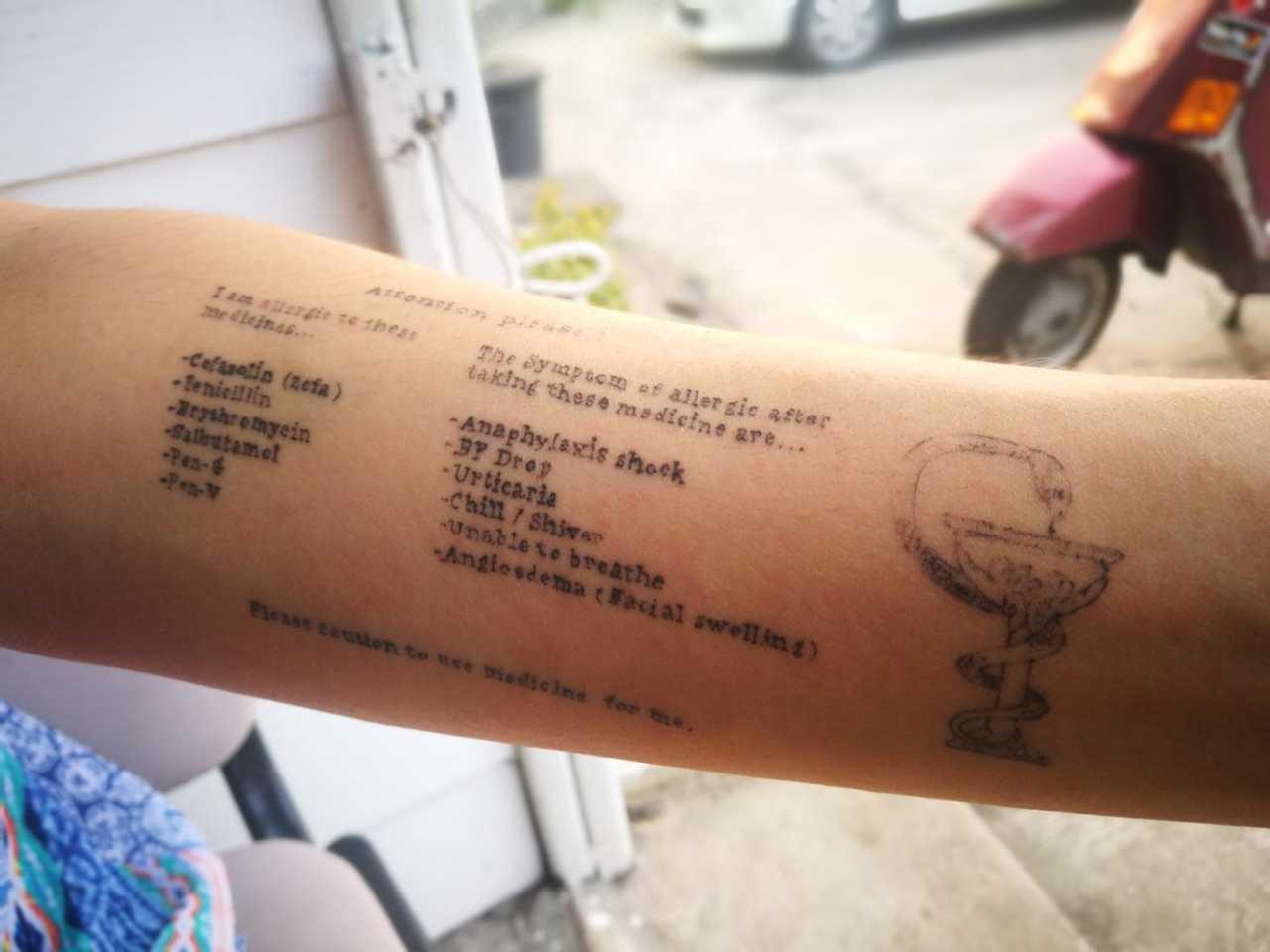 ทั้งนี้ เราได้แจ้งทางโรงพยาบาลไปแล้ว แล้วก็ฉีดยาฆ่าเชื้อเข้าไปเป็นยาแก้แพ้ แต่เป็นคนละกลุ่มที่ตนเองแพ้ แต่ปรากฏว่าแพ้หนัก ถึงขั้นต้องเข้าห้องไอซียู 2 คืน เป็นการแพ้ขั้นรุนแรง จากนั้นก็เกิดความกลัว เพราะหากเราได้รับสารเดิมๆ เข้าไป การแพ้ก็เพิ่มขึ้นเรื่อยๆ จึงเป็นที่มาของรอยสักนี้