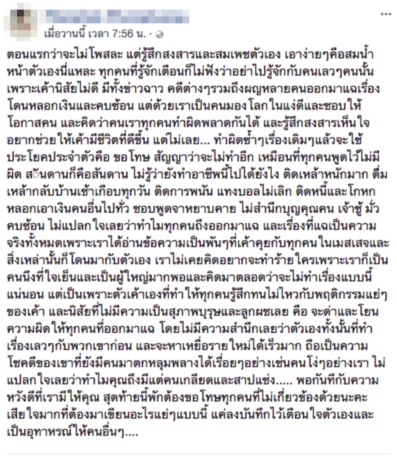 นอกจากนี้สาวคนดังกล่าวยังระบุว่า แฟนหนุ่มนักบอลคนนี้ติดเหล้าหนักมาก ติดการพนัน แทงบอลไม่เลิก ติดหนี้และโกหกหลอกเอาเงินคนอื่นไปทั่ว ชอบพูดจาหยาบคาย ไม่สำนึกบุญคุณคน เจ้าชู้ มั่ว คบซ้อน ไม่แปลกใจเลยว่าทำไมทุกคนถึงออกมาแฉ