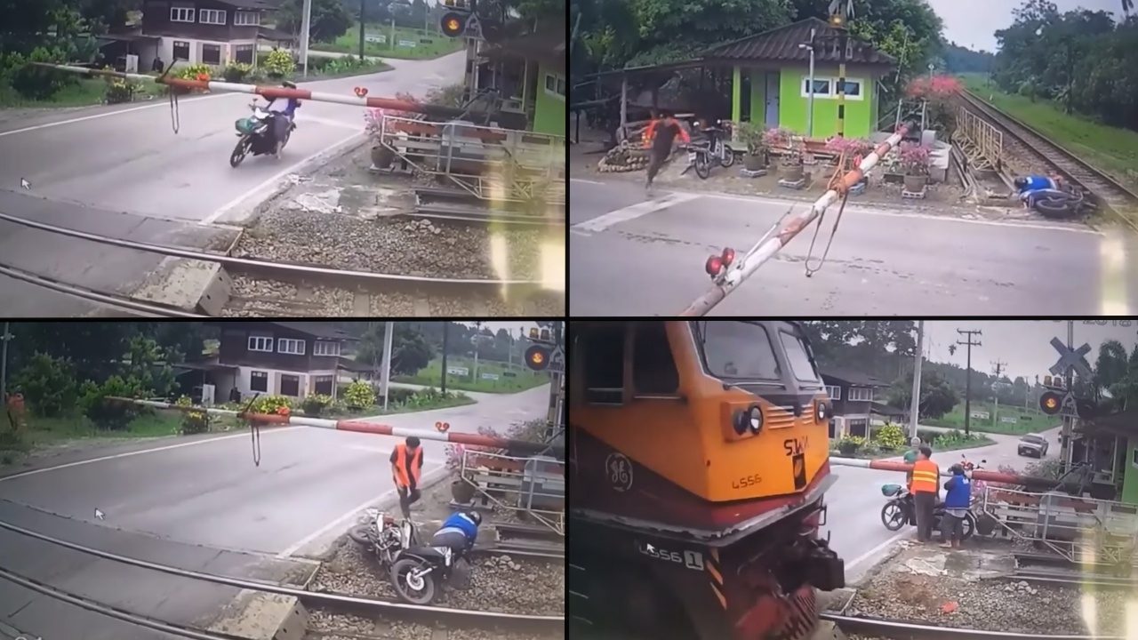 การรถไฟแห่งประเทศไทย เผยแพร่คลิปผ่านแฟนเพจ หลังกล้องวงจรปิดจับภาพนาทีระทึก หญิงขี่จักรยานยนต์พุ่งเข้าหาเครื่องกั้นเสยเข้าที่ศีรษะอย่างจัง ล้มลงใกล้ราง โชคดีพนักงานวิ่งมาช่วยทัน