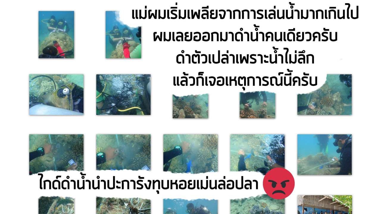 ผู้ใช้เฟซบุ๊ก ก้าน กิ่ง โพสต์ข้อความผ่านกลุ่ม Thailand Underwater Photography พร้อมระบุว่า ผมเป็นคนลงรูปจำนวนหนึ่ง เพื่อขอความช่วยเหลือในการค้นหาผู้กระทำผิด และแจ้งต่อหน่วยงานที่เกี่ยวข้อง กรณีไกด์ดำน้ำใช้ปะการังทุบหอยเม่น เพื่อล่อปลามาถ่ายรูปกับนักท่องเที่ยวที่เกาะเฮ จังหวัดภูเก็ต