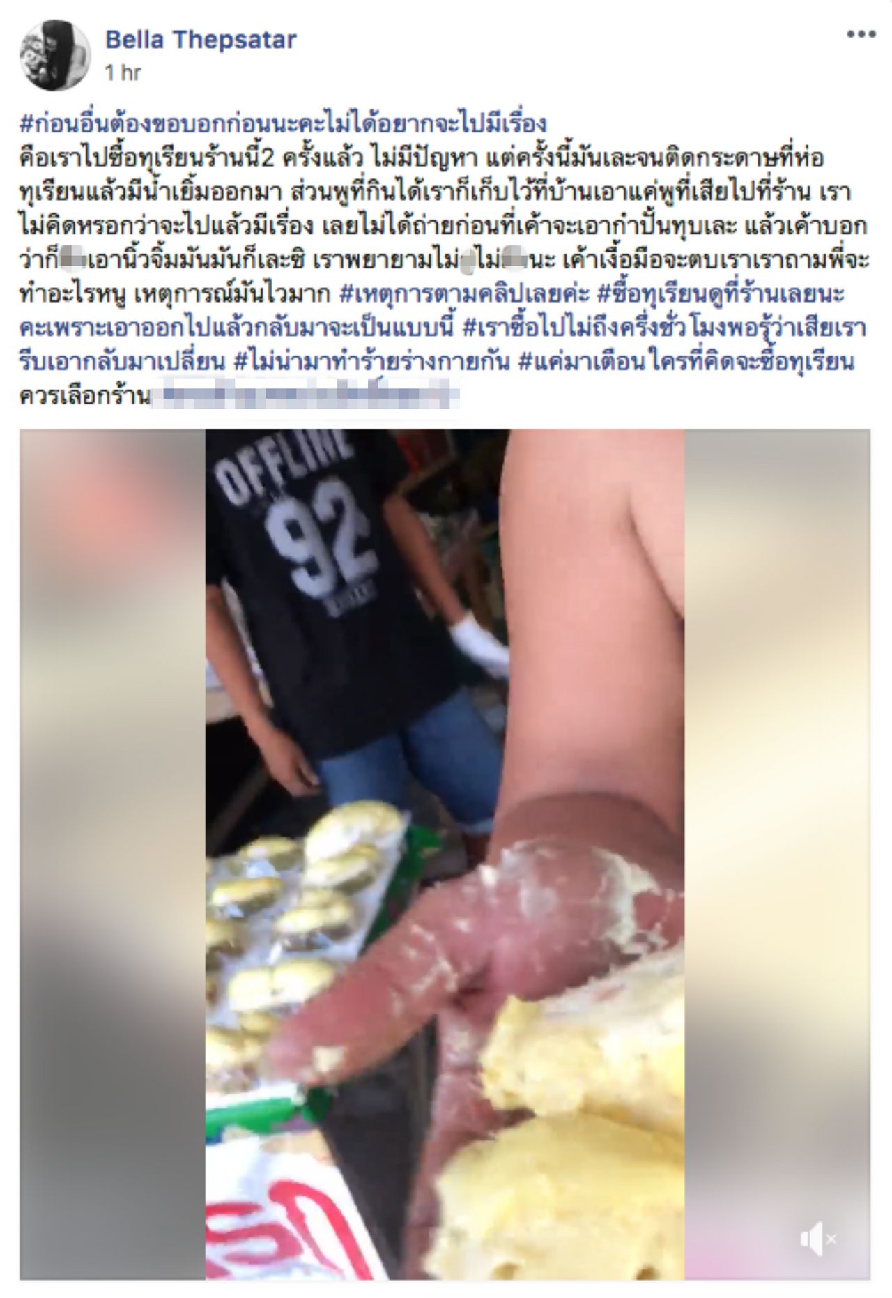 เมื่อวันที่ 10 พ.ค. 61 ผู้ใช้เฟซบุ๊ก Bella Thepsatar โพสต์คลิปไปยังกลุ่มสาธารณะ พัทยาทอล์ค พร้อมข้อความระบุถึงเหตุการณ์ขณะนำทุเรียนเนื้อเละไปคืน ว่า “#ก่อนอื่นต้องขอบอกก่อนนะคะไม่ได้อยากจะไปมีเรื่อง คือเราไปซื้อทุเรียนร้านนี้ 2 ครั้งแล้ว ไม่มีปัญหา แต่ครั้งนี้มันเละจนติดกระดาษที่ห่อทุเรียนแล้วมีน้ำเยิ้มออกมา ส่วนพูที่กินได้เราก็เก็บไว้ที่บ้านเอาแค่พูที่เสียไปที่ร้าน เราไม่คิดหรอกว่าจะไปแล้วมีเรื่อง เลยไม่ได้ถ่ายก่อนที่เขาจะเอากำปั้นทุบเละ แล้วเขาบอกว่าก็มึ_เอานิ้วจิ้มมัน มันก็เละซิ เราพยายามไม่หยาบนะ เขาเงื้อมือจะตบเรา เราถามพี่จะทำอะไรหนู เหตุการณ์มันไวมาก #เหตุการตามคลิปเลยค่ะ #ซื้อทุเรียนดูที่ร้านเลยนะคะเพราะเอาออกไปแล้วกลับมาจะเป็นแบบนี้ #เราซื้อไปไม่ถึงครึ่งชั่วโมงพอรู้ว่าเสียเรารีบเอากลับมาเปลี่ยน #ไม่น่ามาทำร้ายร่างกายกัน #แค่มาเตือนใครที่คิดจะซื้อทุเรียนควรเลือกร้าน”