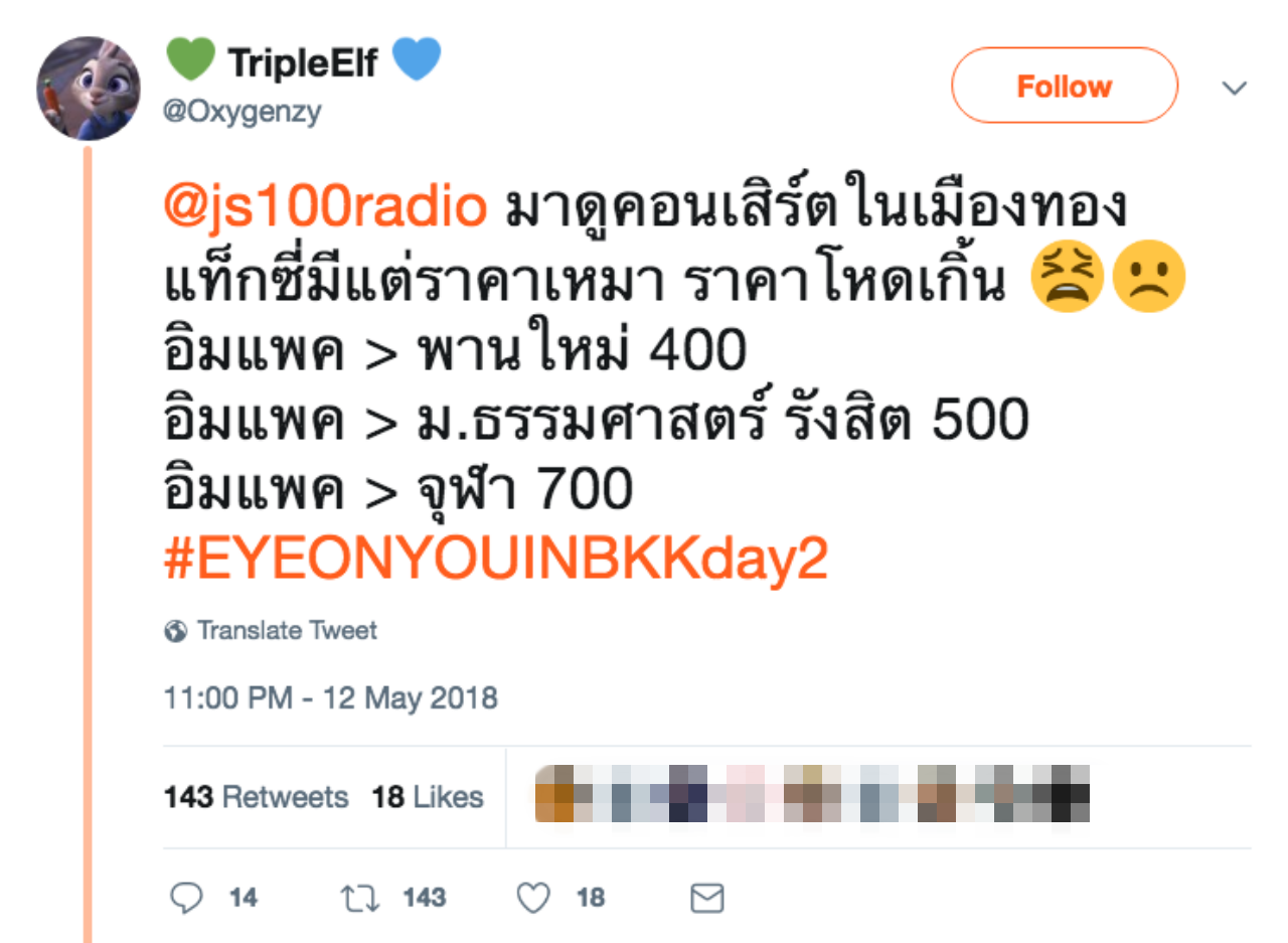 เมื่อวันที่ 12 พ.ค. 61 ที่ผ่านมา ผู้ใช้ทวิตเตอร์รายหนึ่งร้องเรียนผ่านไปยังทวิตเตอร์ js100radio โดยระบุข้อความว่า “มาดูคอนเสิร์ตในเมืองทอง แท็กซี่มีแต่ราคาเหมา ราคาโหดเกิน อิมแพค ไป สะพานใหม่ 400 / อิมแพค ไป ม.ธรรมศาสตร์ รังสิต 500 / อิมแพค ไป จุฬา 700”